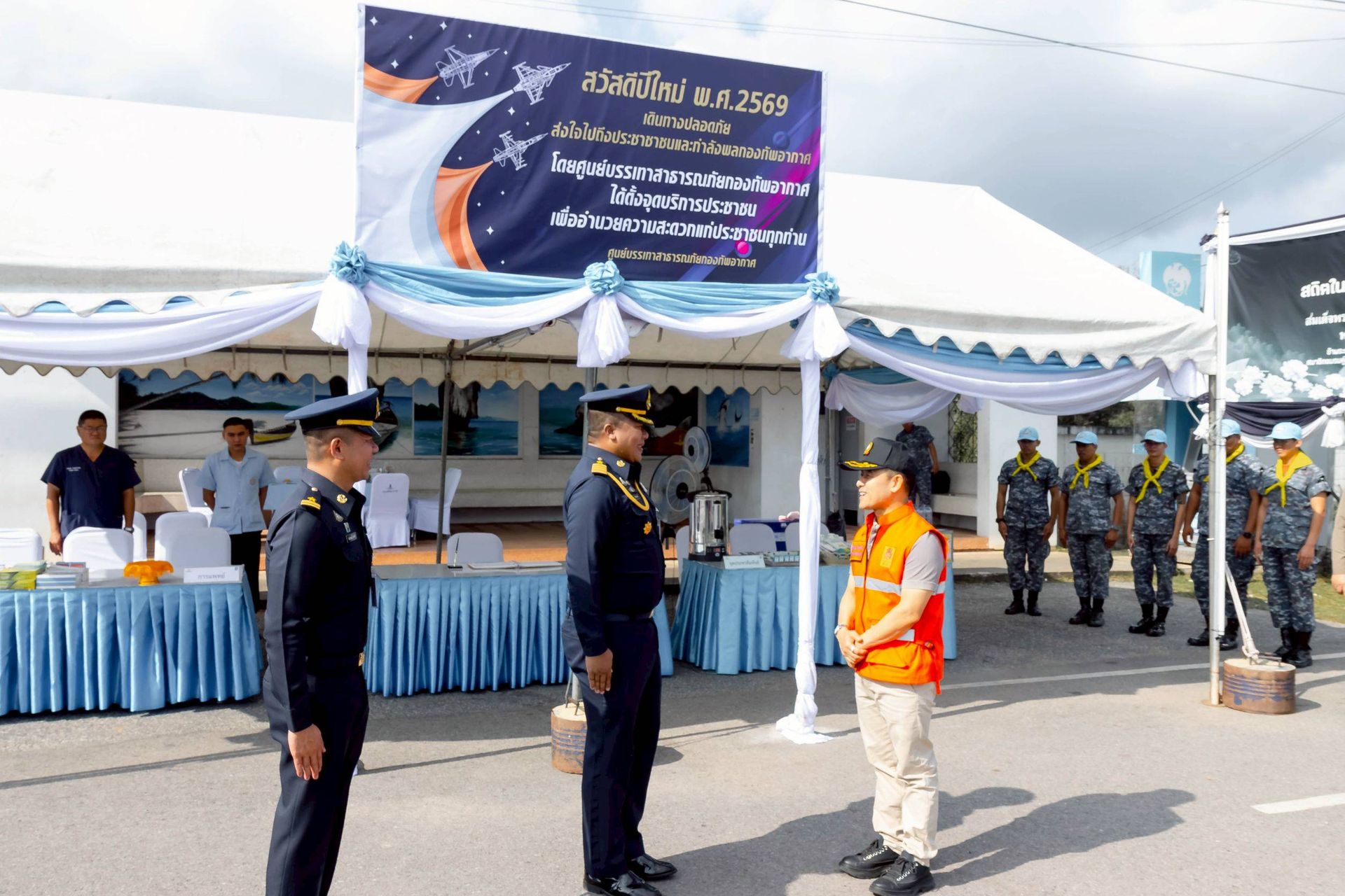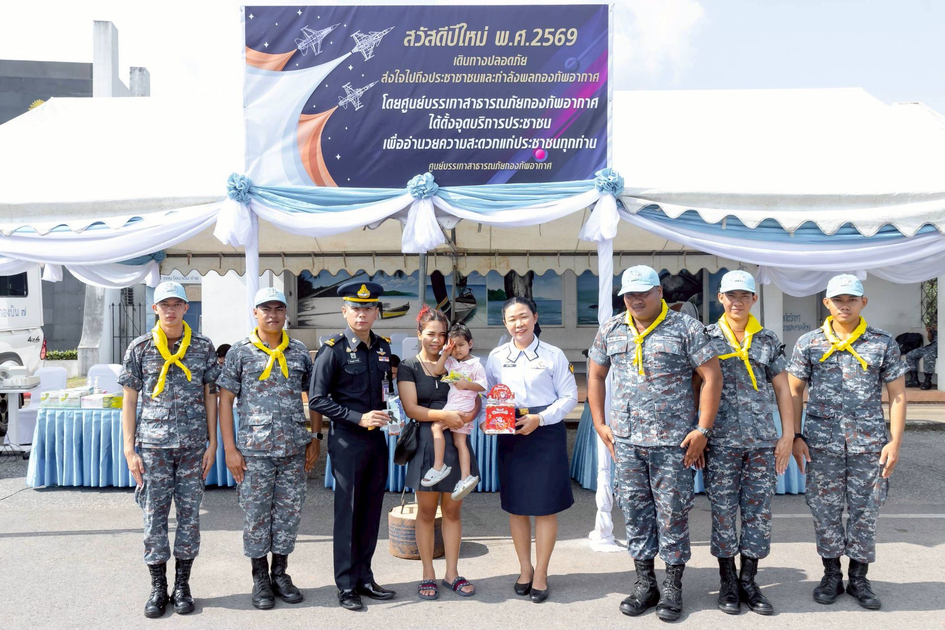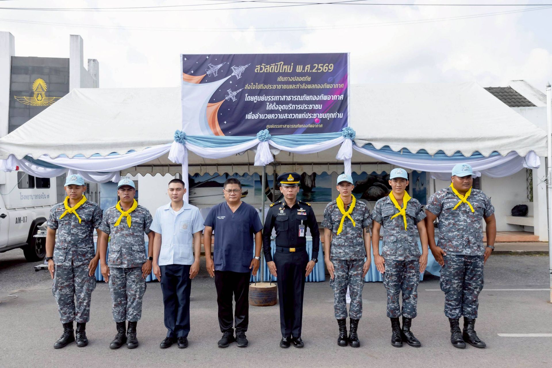 โอกาสนี้ นาวาอากาศเอก ศุภวัจน์ จิตรมนตรี ผู้บังคับการกองบิน ๗ มอบหมายให้ นาวาอากาศเอก ชัยพร จรรยา เสนาธิการกองบิน ๗ พร้อมด้วยเจ้าหน้าที่ประจำจุดให้บริการฯ ร่วมให้การต้อนรับ เมื่อวันที่ ๓๑ ธันวาคม พ.ศ.๒๕๖๘ ณ บริเวณหน้าช่องทางหลัก กองบิน ๗ ตำบลมะลวน อำเภอพุนพิน จังหวัดสุราษฎร์ธานี