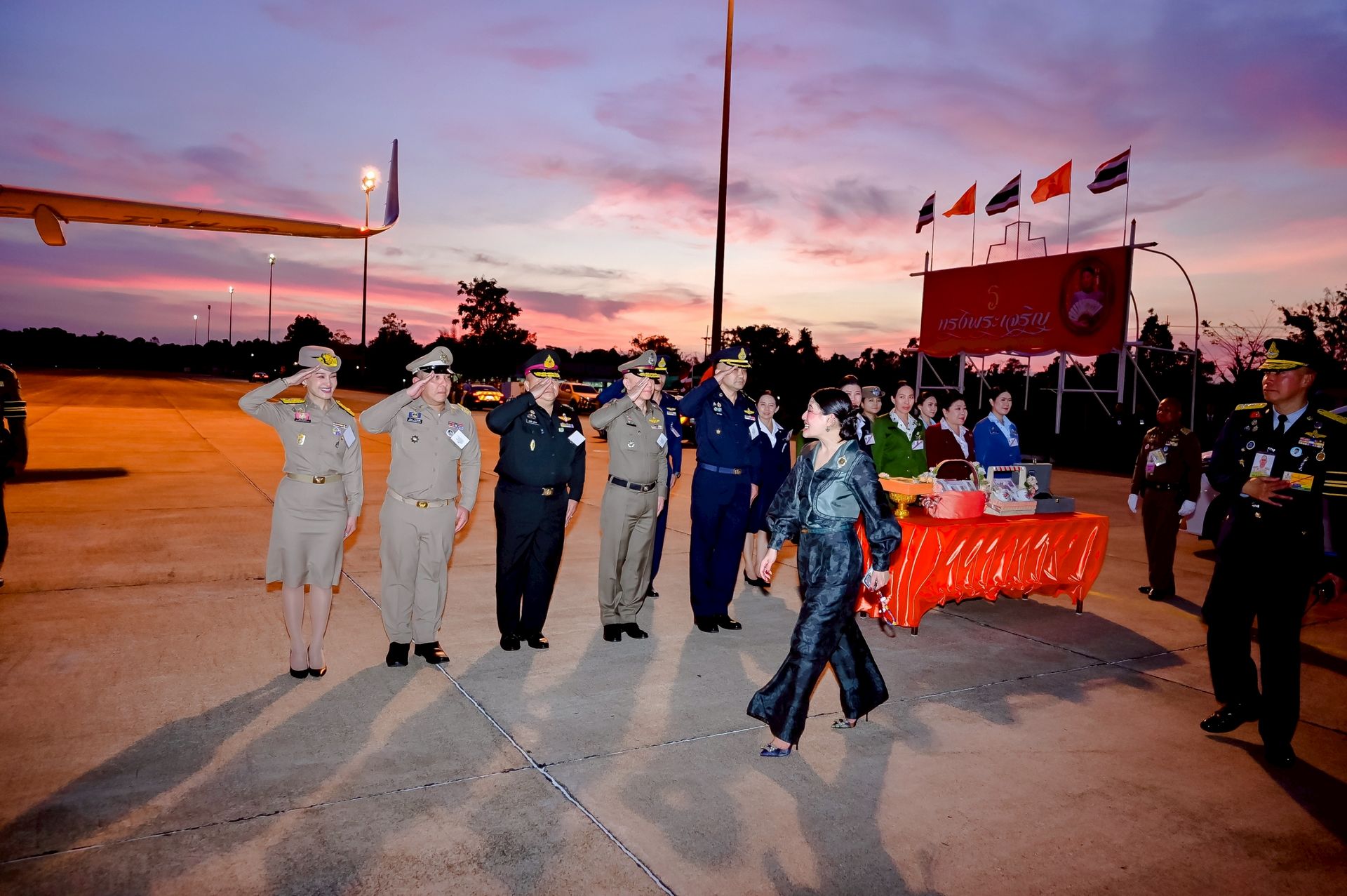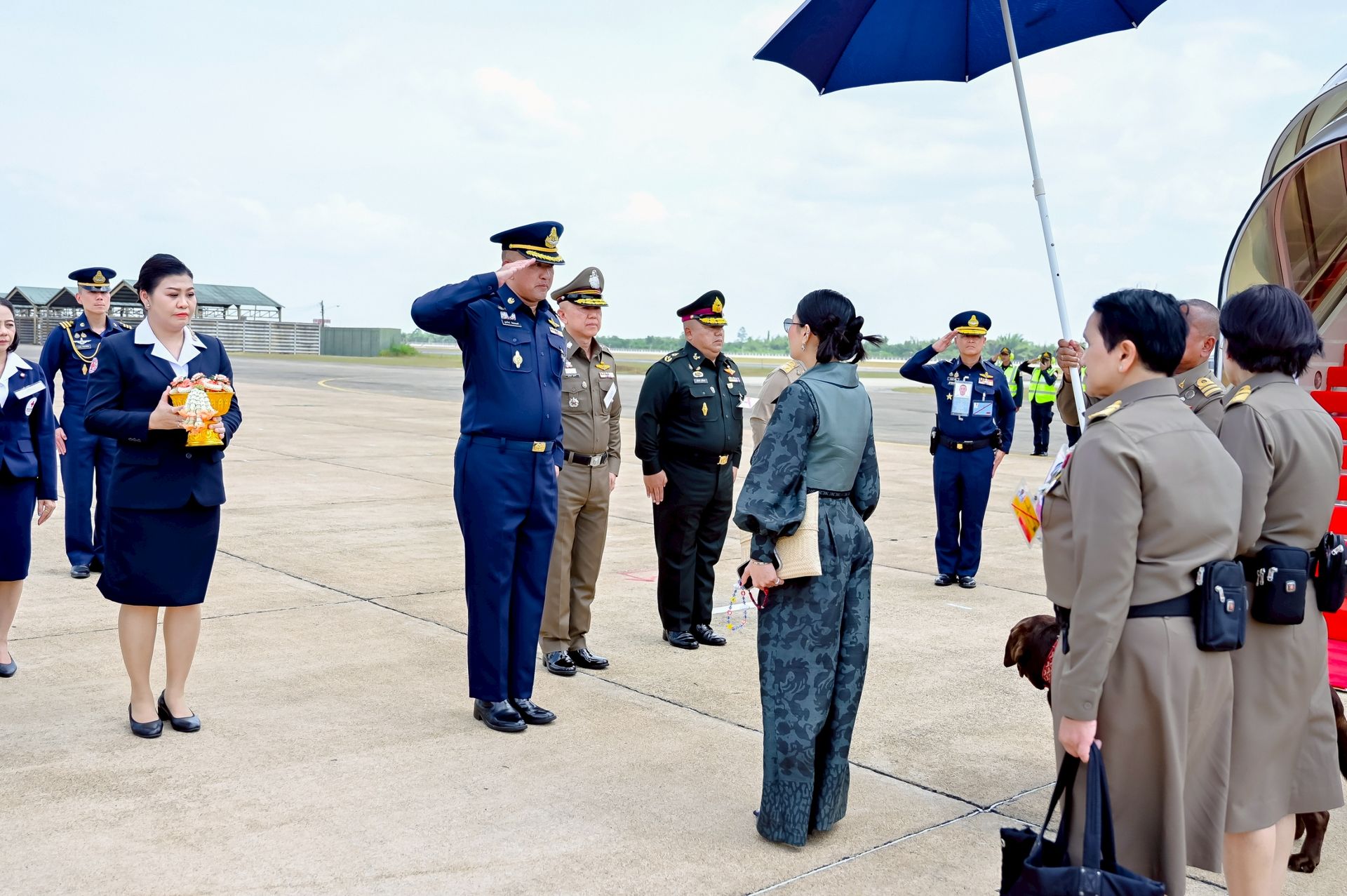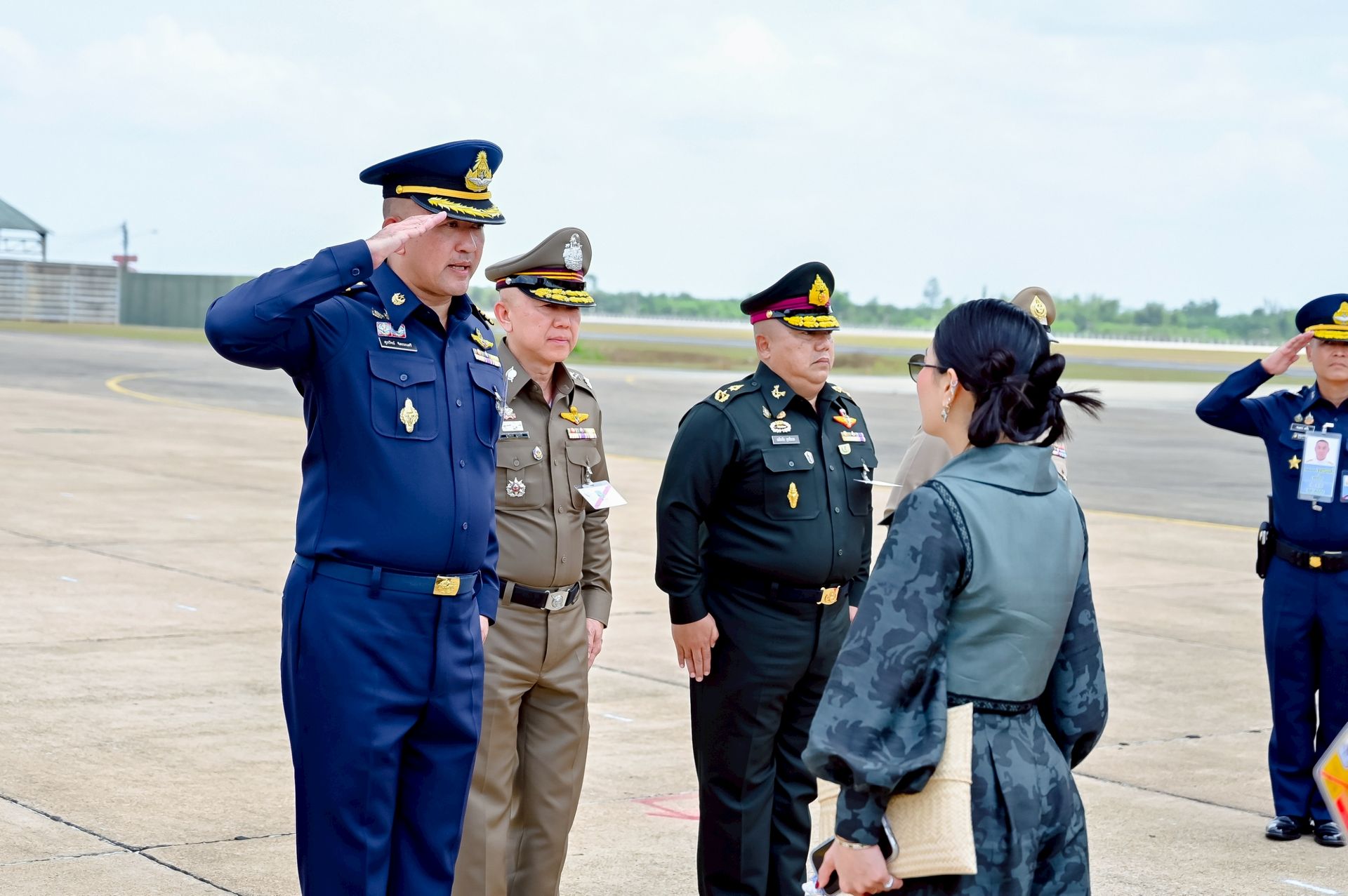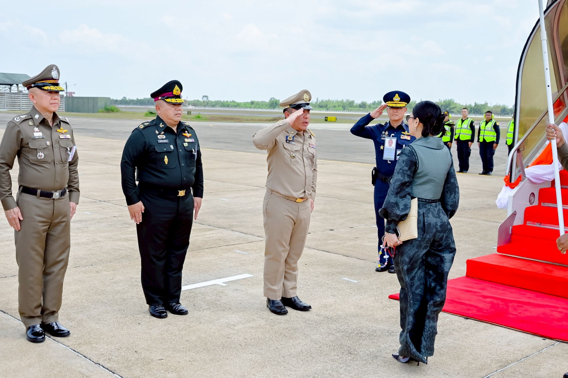 โอกาสนี้ นาวาอากาศเอก ศุภวัจน์ จิตรมนตรี ผู้บังคับการกองบิน ๗ พร้อมด้วย รองผู้บังคับการกองบิน ๗ และ นาวาอากาศตรีหญิง ชนกนันท์ จรรยา รองประธานชมรมคู่สมรสทหารอากาศ กองบิน ๗(๓) ร่วมรับ-ส่งเสด็จ เมื่อวันที่ ๒๐ กุมภาพันธ์ พ.ศ.๒๕๖๙ ณ ท่าอากาศยานทหารกองบิน ๗ ตำบลมะลวน อำเภอพุนพิน จังหวัดสุราษฎร์ธานี