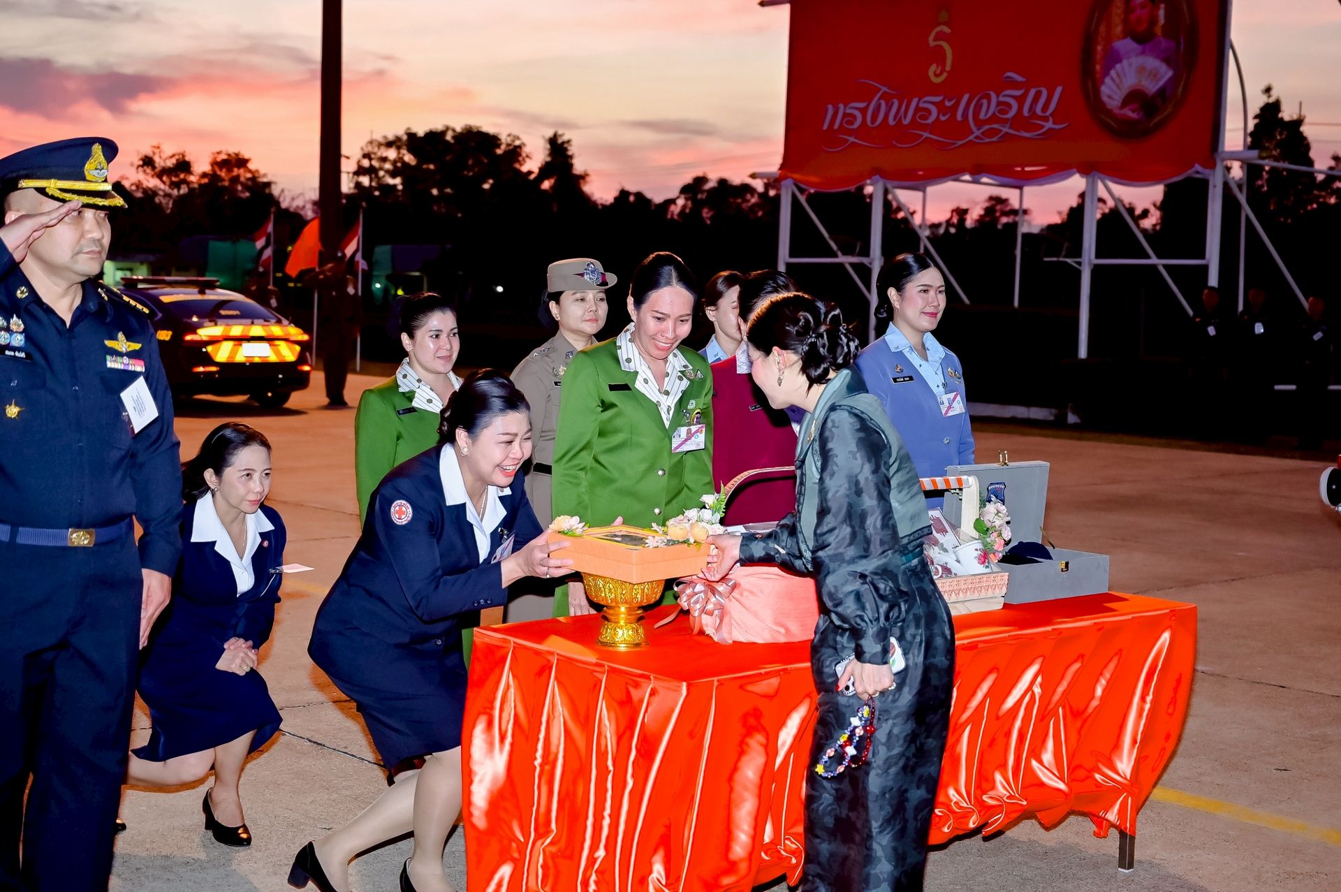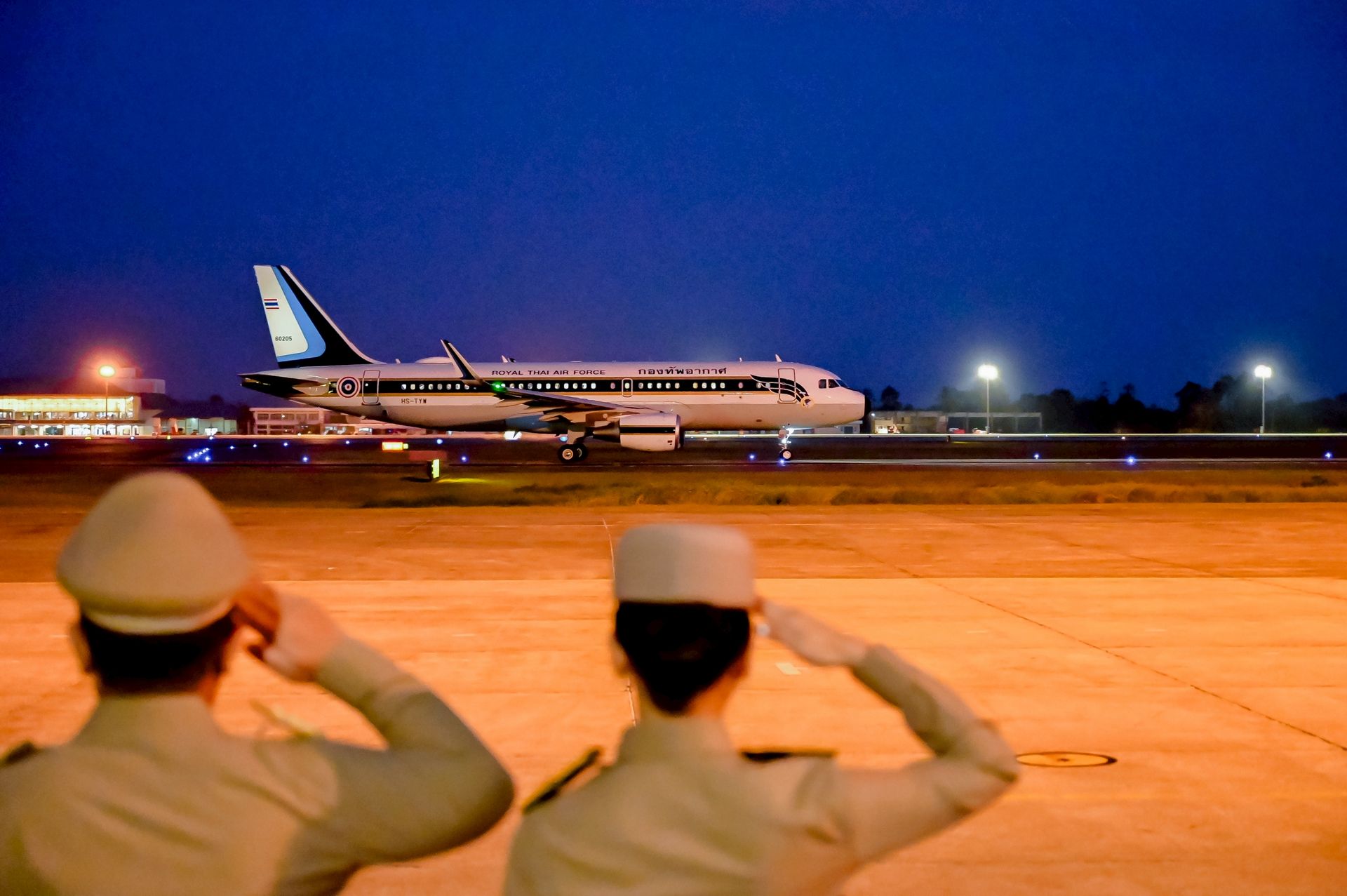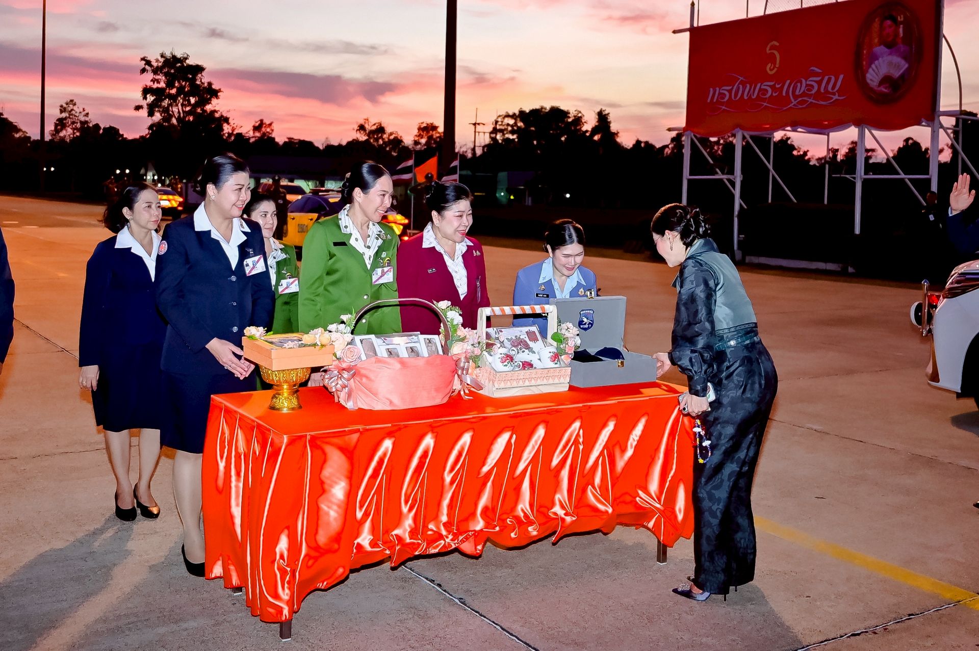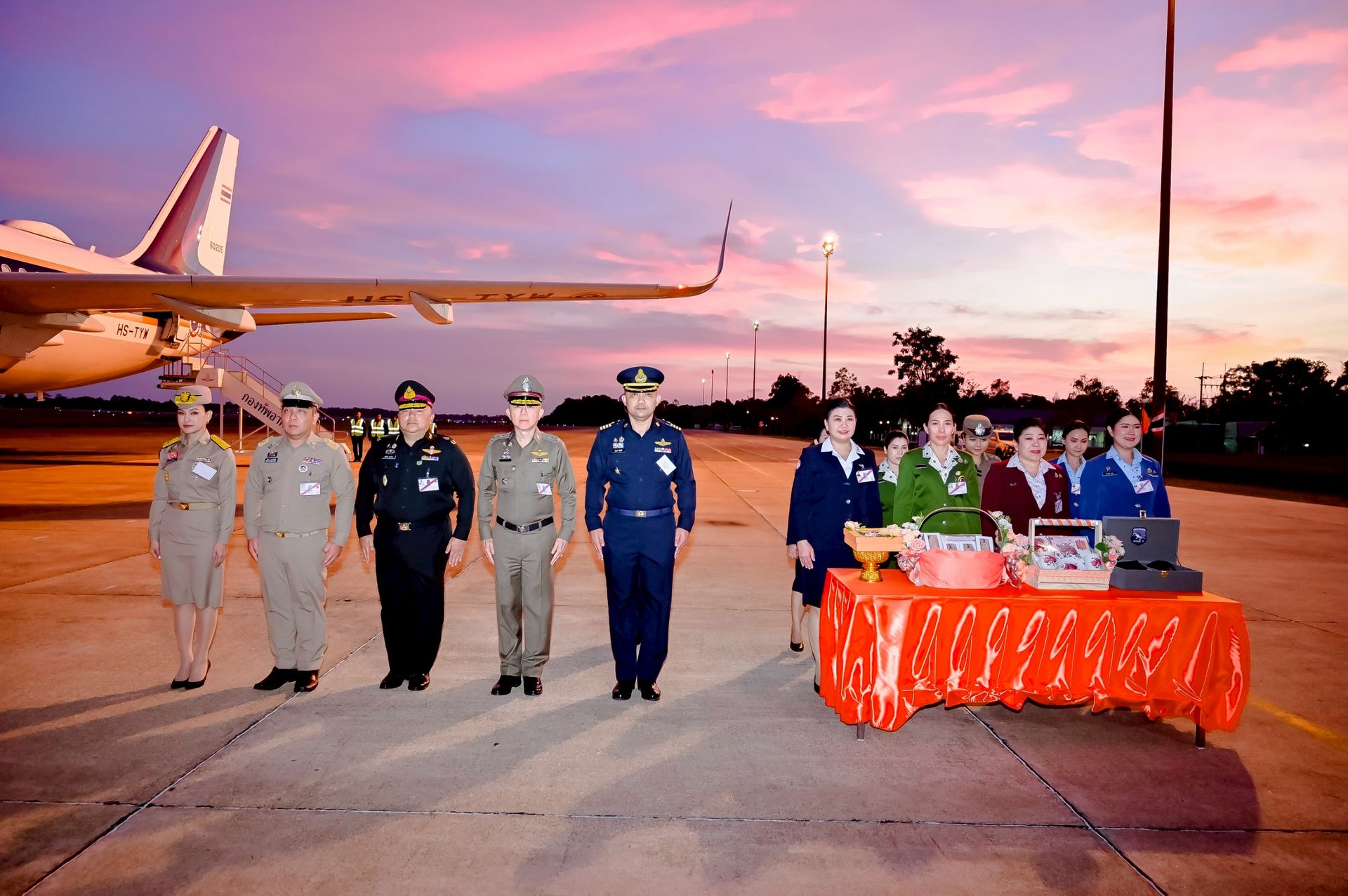 โอกาสนี้ นาวาอากาศเอก ศุภวัจน์ จิตรมนตรี ผู้บังคับการกองบิน ๗ พร้อมด้วย รองผู้บังคับการกองบิน ๗ และ นาวาอากาศตรีหญิง ชนกนันท์ จรรยา รองประธานชมรมคู่สมรสทหารอากาศ กองบิน ๗(๓) ร่วมรับ-ส่งเสด็จ เมื่อวันที่ ๒๐ กุมภาพันธ์ พ.ศ.๒๕๖๙ ณ ท่าอากาศยานทหารกองบิน ๗ ตำบลมะลวน อำเภอพุนพิน จังหวัดสุราษฎร์ธานี