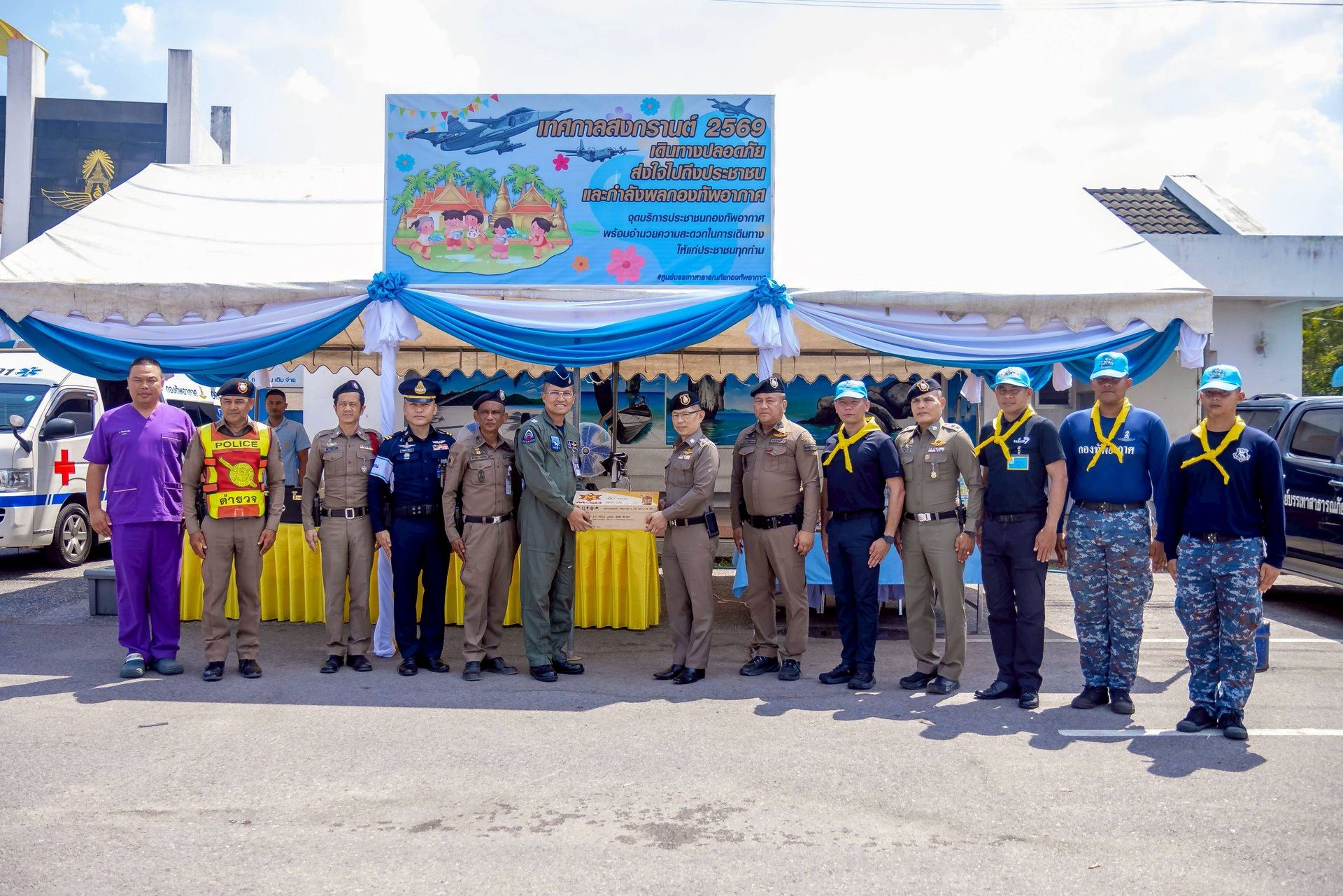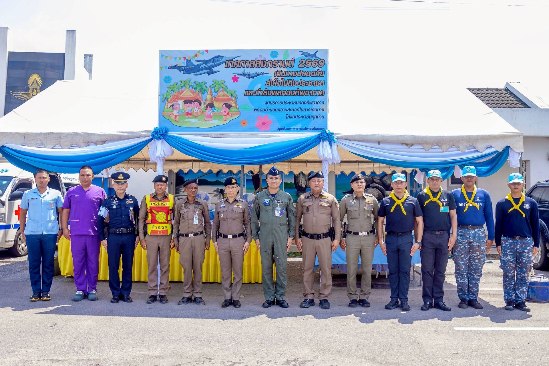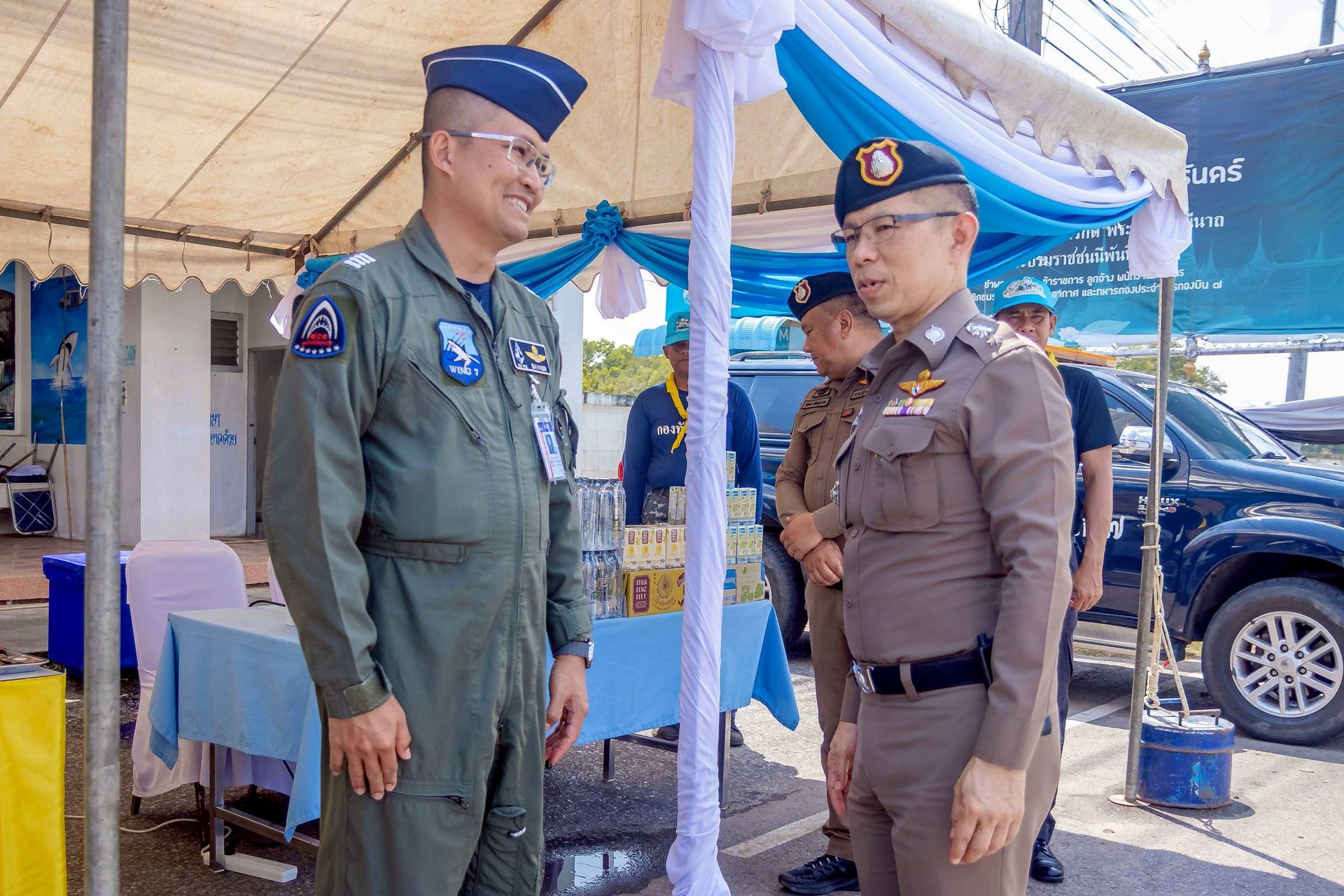โอกาสนี้ นาวาอากาศเอก ศุภวัจน์ จิตรมนตรี ผู้บังคับการกองบิน ๗ มอบหมายให้ นาวาอากาศเอก เฉลิมชัย ชำนาญยนต์ รองผู้บังคับการกองบิน ๗ จิตอาสา 904 จิตอาสาพระราชทานสังกัดกองบิน ๗ และเจ้าหน้าที่ประจำจุดให้บริการฯ ร่วมให้การต้อนรับ ณ บริเวณด้านหน้าช่องทางหลัก กองบิน ๗ ตำบลมะลวน อำเภอพุนพิน จังหวัดสุราษฎร์ธานี เมื่อวันที่ ๑๕ เมษายน พ.ศ. ๒๕๖๙