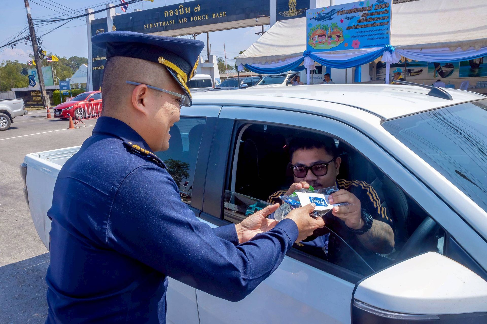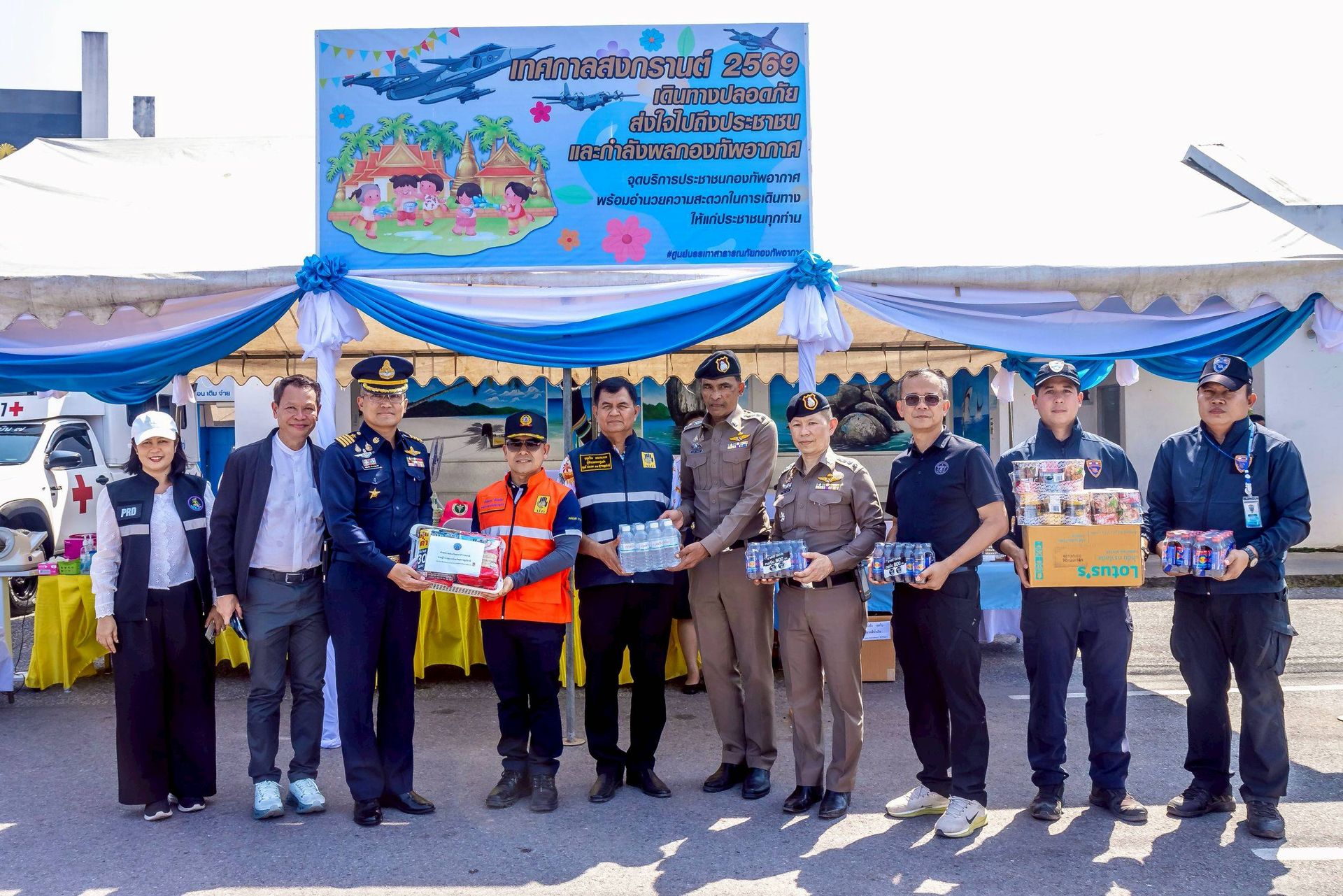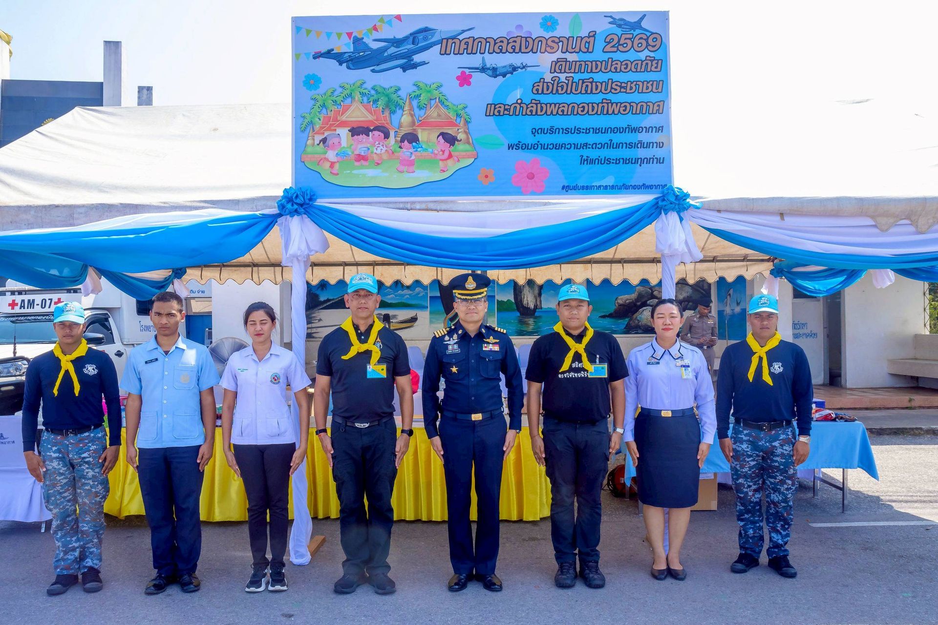 โอกาสนี้ นาวาอากาศเอก ศุภวัจน์ จิตรมนตรี ผู้บังคับการกองบิน ๗ มอบหมายให้ นาวาอากาศเอก เฉลิมชัย ชำนาญยนต์ รองผู้บังคับการกองบิน ๗ จิตอาสา 904 จิตอาสาพระราชทานสังกัดกองบิน ๗ และเจ้าหน้าที่ประจำจุดให้บริการฯ ณ บริเวณด้านหน้าช่องทางหลัก กองบิน ๗ ตำบลมะลวน อำเภอพุนพิน จังหวัดสุราษฎร์ธานี ตลอดจนเข้าร่วมรับการตรวจจุดบริการประชาชน ของวิทยาลัยสารพัดช่างสุราษฎร์ธานี ณ บริเวณสถานีบริการเชื้อเพลิงสวัสดิการ กองบิน ๗ ตำบลมะลวน อำเภอพุนพิน จังหวัดสุราษฎร์ธานี เมื่อวันที่ ๑๐ เมษายน พ.ศ. ๒๕๖๙