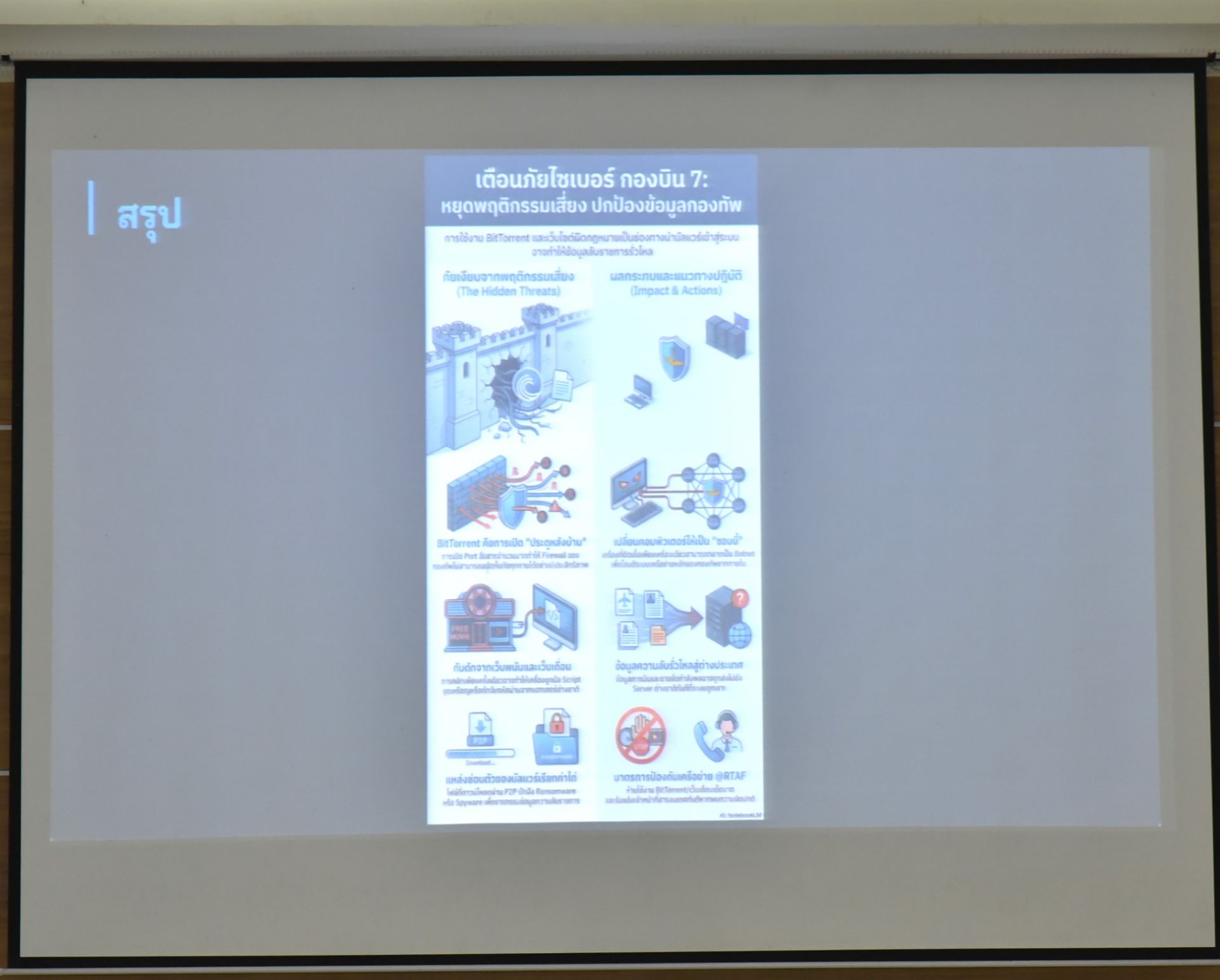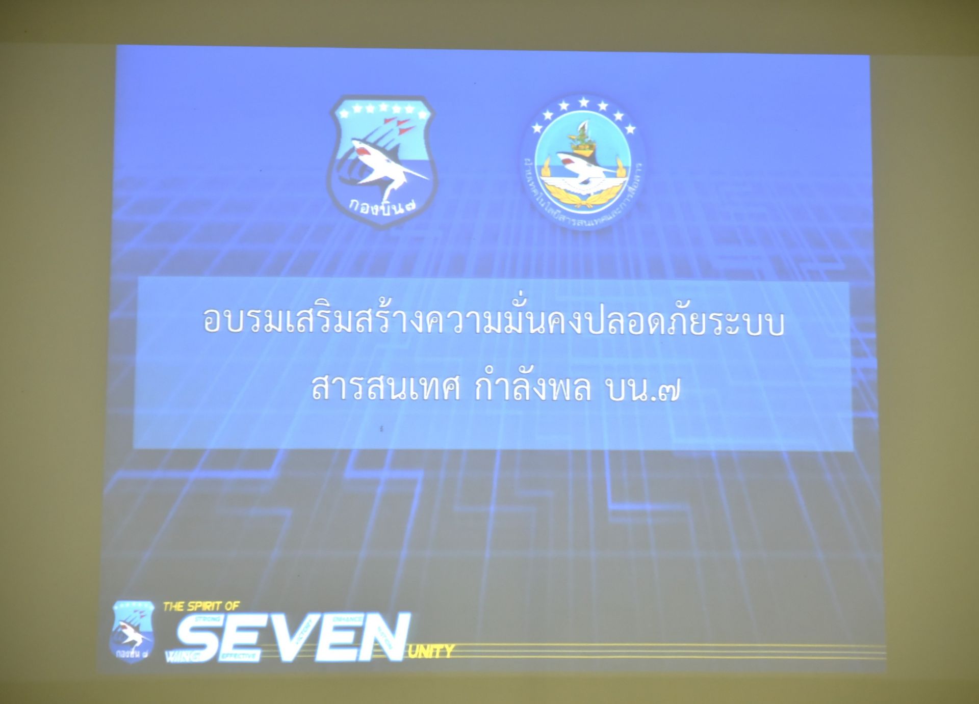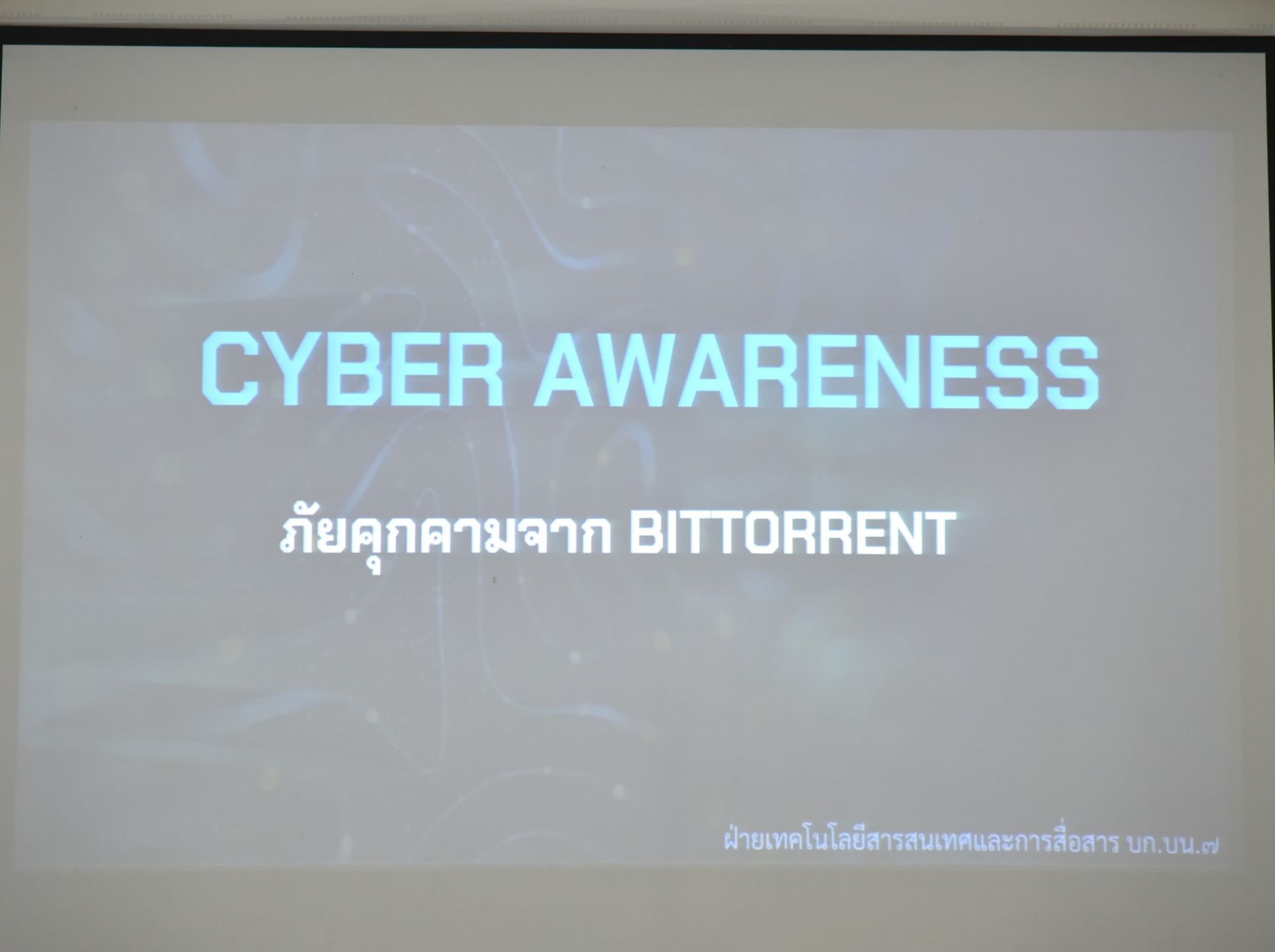 นาวาอากาศเอก ศุภวัจน์ จิตรมนตรี ผู้บังคับการกองบิน ๗ มอบหมายให้ ฝ่ายเทคโนโลยีสารสนเทศ กองบังคับการ กองบิน ๗ จัดกิจกรรมอบรมให้ความรู้แก่ข้าราชการ ลูกจ้าง พนักงานราชการ กองบิน ๗ ให้มีความตระหนักรู้ ความมั่นคง ปลอดภัยทางไซเบอร์ และอันตรายของโปรแกรม Bit Torrent เมื่อวันที่ ๑๑ กุมภาพันธ์ พ.ศ.๒๕๖๙ ณ หอประชุมธูปะเตมีย์ กองบิน ๗ ตำบลมะลวน อำเภอพุนพิน จังหวัดสุราษฎร์ธานี