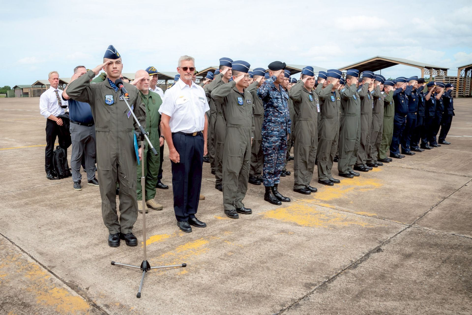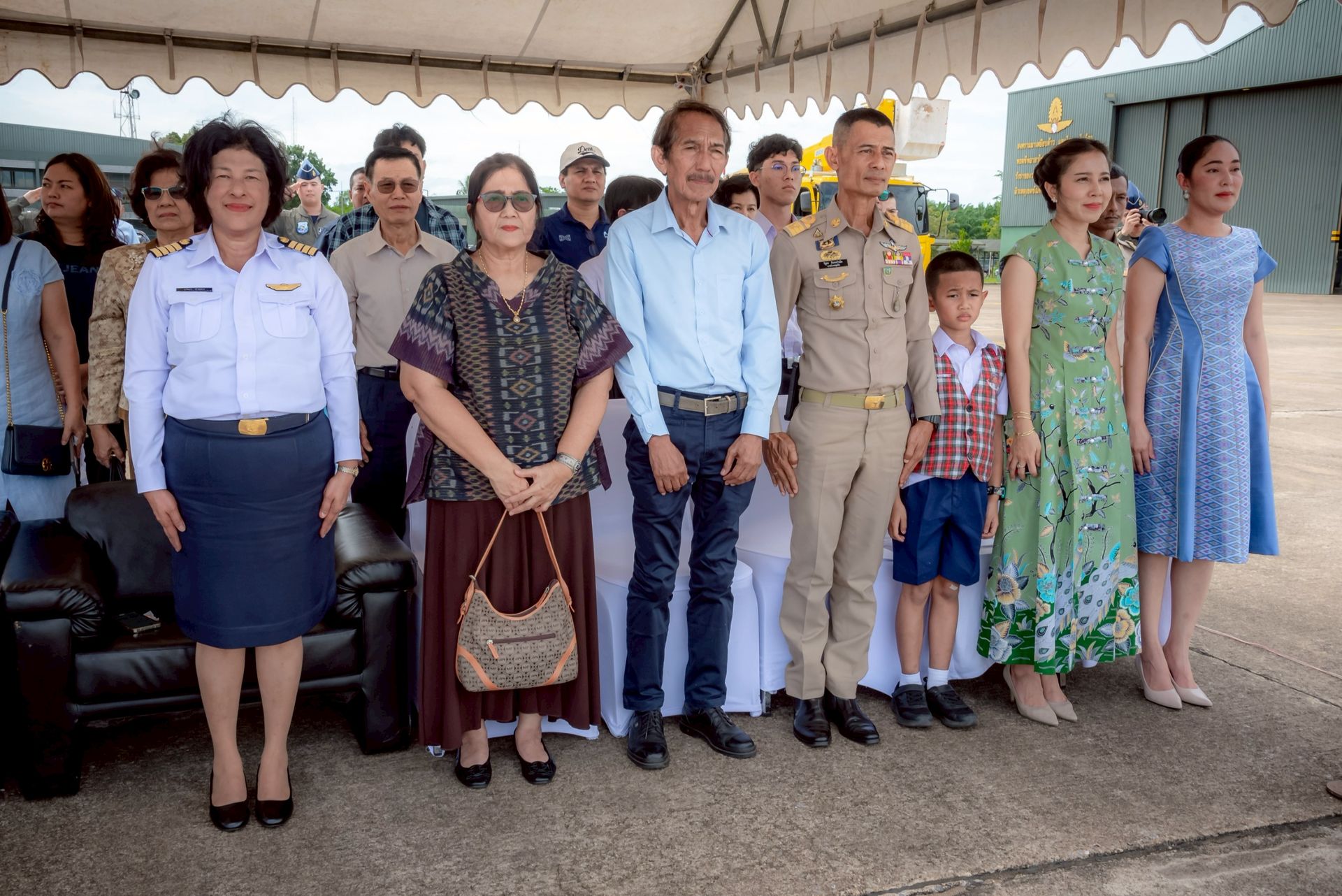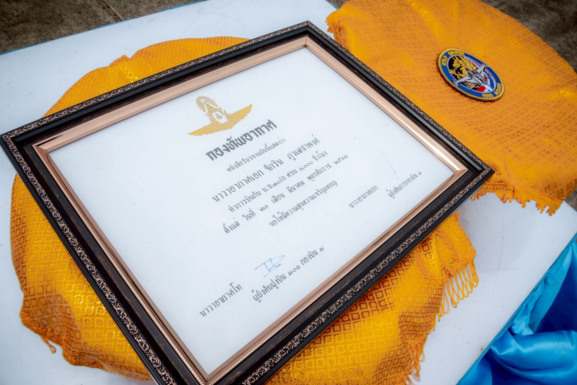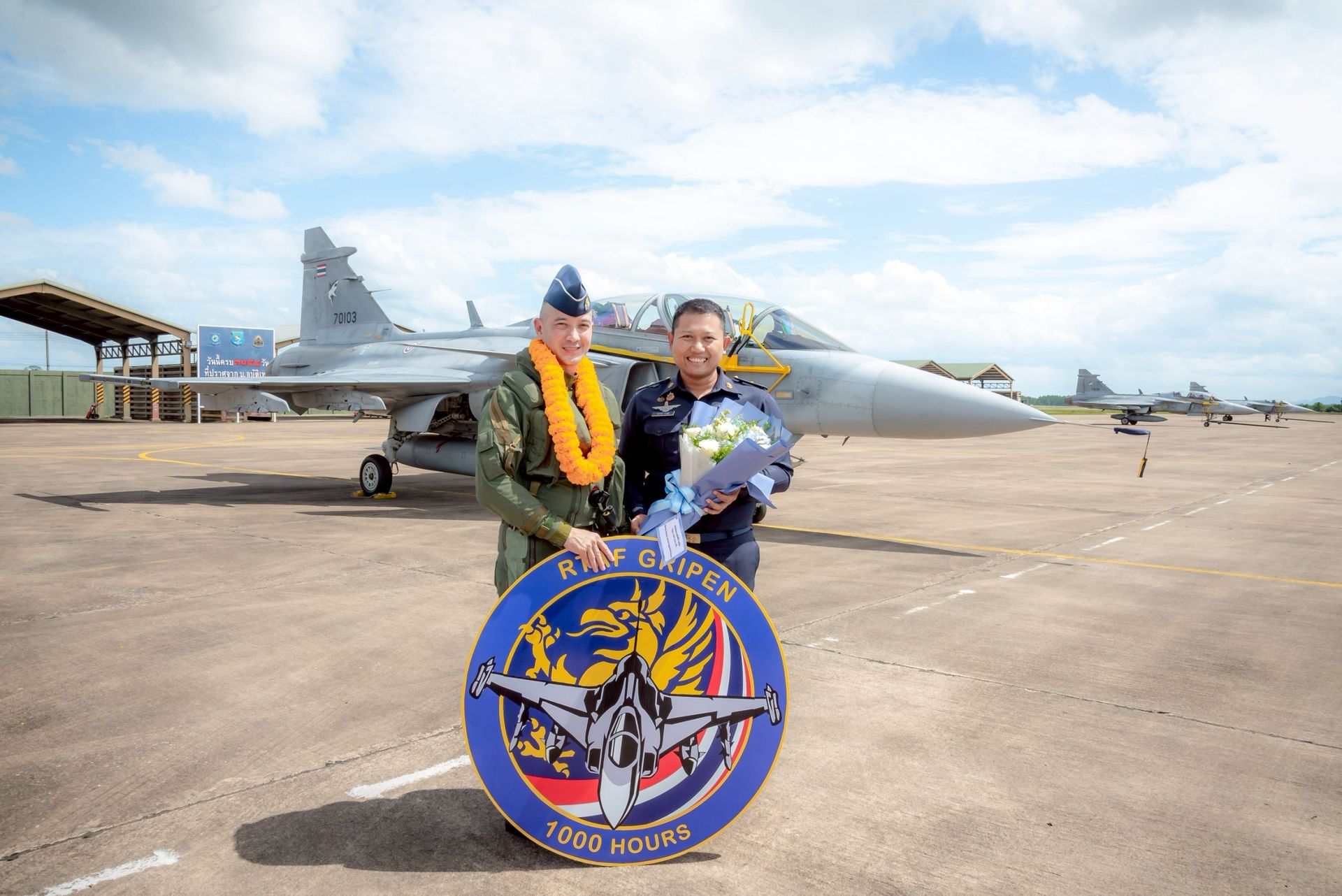 นาวาอากาศเอก ศุภวัจน์ จิตรมนตรี ผู้บังคับการกองบิน ๗ ประธานในพิธีแสดงความยินดีนักบินที่ทำการบินกับเครื่องบินขับไล่แบบที่ ๒๐/ก (Gripen) ครบ ๑,๐๐๐ ชั่วโมงบิน ให้แก่