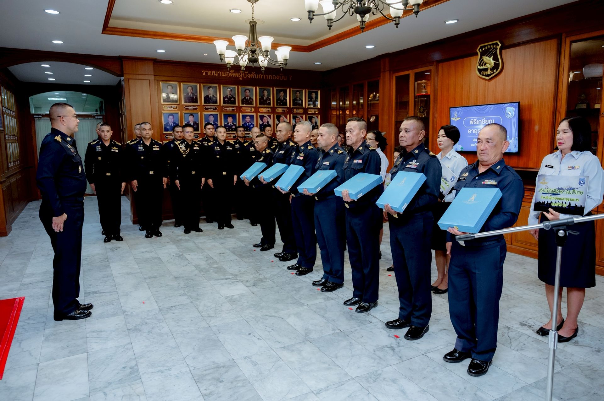 นาวาอากาศเอก ศุภวัจน์ จิตรมนตรี ผู้บังคับการกองบิน ๗ เป็นประธานในการประกอบพิธีเกษียณอายุราชการแก่กำลังพลประจำการ สังกัดกองบิน ๗ ประจำปี ๒๕๖๘ เพื่อเป็นการสดุดีคุณความดีที่ได้ปฏิบัติ ราชการครบกำหนดเกษียณอายุราชการ ให้เกิดความประทับใจ สง่างาม และสมเกียรติ พร้อมทั้งมอบของที่ระลึกให้แก่ผู้เกษียณอายุราชการ โดยมี รองผู้บังคับการกองบิน ๗ เสนาธิการกองบิน ๗ และหัวหน้าหน่วยขึ้นตรง กองบิน ๗ ร่วมเป็นเกียรติในพิธีฯ เมื่อวันที่ ๑๘ กันยายน พ.ศ.๒๕๖๘ ณ ห้องโถง กองบังคับการ กองบิน ๗ ตำบลมะลวน อำเภอพุนพิน จังหวัดสุราษฎร์ธานี