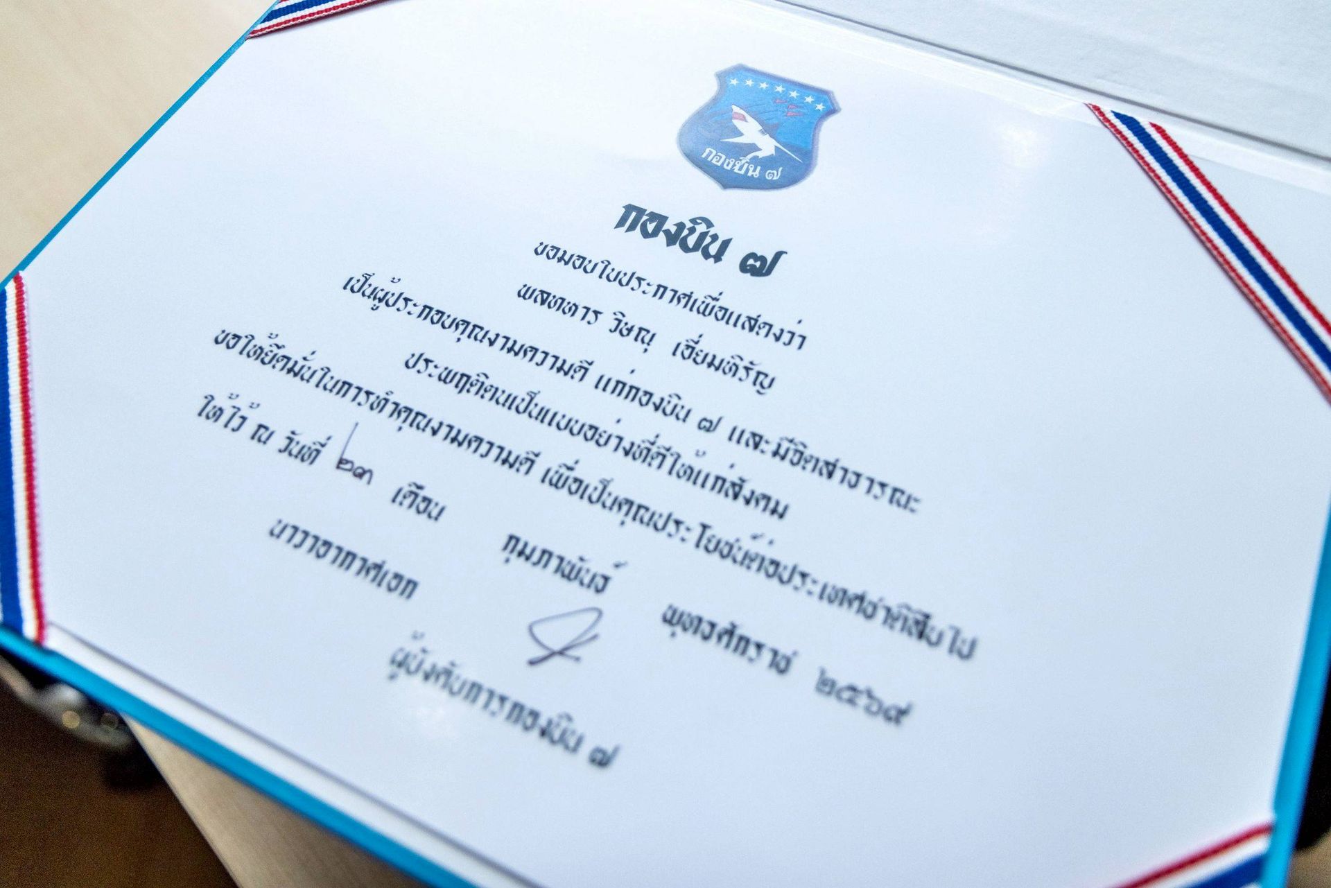 นาวาอากาศเอก ศุภวัจน์ จิตรมนตรี ผู้บังคับการกองบิน ๗ เป็นประธานในพิธีมอบใบประกาศนียบัตรเชิดชูเกียรติให้แก่ พลทหาร วิษณุ เอี่ยมหิรัญ สังกัด กองพันอากาศโยธิน กองบิน ๗ เพื่อเป็นการประกาศเกียรติคุณในความกล้าหาญและเสียสละส่วนตนเพื่อส่วนรวม เหตุการณ์แห่งความเสียสละ เหตุการณ์น่าประทับใจนี้เกิดขึ้นในขณะที่ พลทหาร วิษณุฯ กำลังเดินทางโดยรถโดยสารประจำทางจากจังหวัดชลบุรี มุ่งหน้าสู่กรุงเทพมหานคร เพื่อเข้าสอบคัดเลือกเป็น "นักเรียนจ่าอากาศ" ซึ่งถือเป็นก้าวสำคัญของอนาคตรับราชการที่เจ้าตัวตั้งใจ ทว่าในระหว่างการเดินทาง พลทหาร วิษณุฯ ได้พบเห็นเหตุการณ์สุภาพสตรีรายหนึ่งกำลังถูกกระทำอนาจารบนรถโดยสาร ด้วยจิตวิญญาณของผู้พิทักษ์ประชาชน เขาตัดสินใจเข้าช่วยเหลือผู้เสียหายในทันทีโดยไม่ลังเล พร้อมทั้งแสดงไหวพริบในการประสานเจ้าหน้าที่ตำรวจในพื้นที่เข้าระงับเหตุ และร่วมควบคุมตัวผู้ก่อเหตุไว้ได้สำเร็จ อีกทั้งยังยินดีเป็นพยานให้แก่ผู้เสียหายจนเสร็จสิ้นกระบวนการ แม้จะเป็นช่วงเวลาสำคัญก่อนการสอบของตนเองก็ตาม ขอแสดงความชื่นชมในความกล้าหาญ ไหวพริบ และจิตสำนึกแห่งการปกป้องประชาชนของ พลทหาร วิษณุ เอี่ยมหิรัญ ที่พิสูจน์ให้เห็นว่าความเป็นทหารอยู่ในสายเลือดทุกวินาที