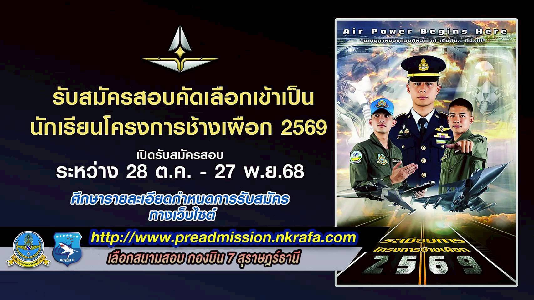นาวาอากาศเอก ศุภวัจน์ จิตรมนตรี ผู้บังคับการกองบิน ๗ มอบหมายให้แผนกกิจการพลเรือน กองบังคับการ กองบิน ๗ ออกประชาสัมพันธ์แนะแนวเส้นทางสู่กองทัพอากาศ ประจำปีการศึกษา ๒๕๖๙ ซึ่งประกอบด้วย การประชาสัมพันธ์โครงการช้างเผือก ปี ๖๙ ในส่วนของโรงเรียนนายเรืออากาศนวมินทกษัตริยาธิราช กองทัพอากาศ รวมถึงเส้นทางการเข้าสู่วิทยาลัยพยาบาลทหารอากาศ และโรงเรียนจ่าอากาศ โดยมีวัตถุประสงค์เพื่อเป็นการประชาสัมพันธ์แนะนำสถาบันการศึกษาในส่วนของกองทัพอากาศ เพื่อให้นักเรียนที่สนใจในสายวิชาชีพทหารได้รับทราบข้อมูล และได้พูดคุยสอบถามข้อมูลจากนักบิน และพยาบาลทหารอากาศ เพื่อเป็นการสร้างแรงบันดาลใจให้กับน้อง ๆ นักเรียนที่อยู่ต่างจังหวัด เป็นการเข้าถึงข้อมูลต่างๆได้เป็นอย่างดี ตลอดจนเสริมสร้างภาพลักษณ์เชิงรุกของหน่วยในการให้ข้อมูลอย่างใกล้ชิดและเป็นกันเอง เมื่อวันที่ ๑๒ พฤศจิกายน พ.ศ.๒๕๖๘ ณ โรงเรียนสุราษฎร์ธานี อำเภอเมืองสุราษฎร์ธานี จังหวัดสุราษฎร์ธานี