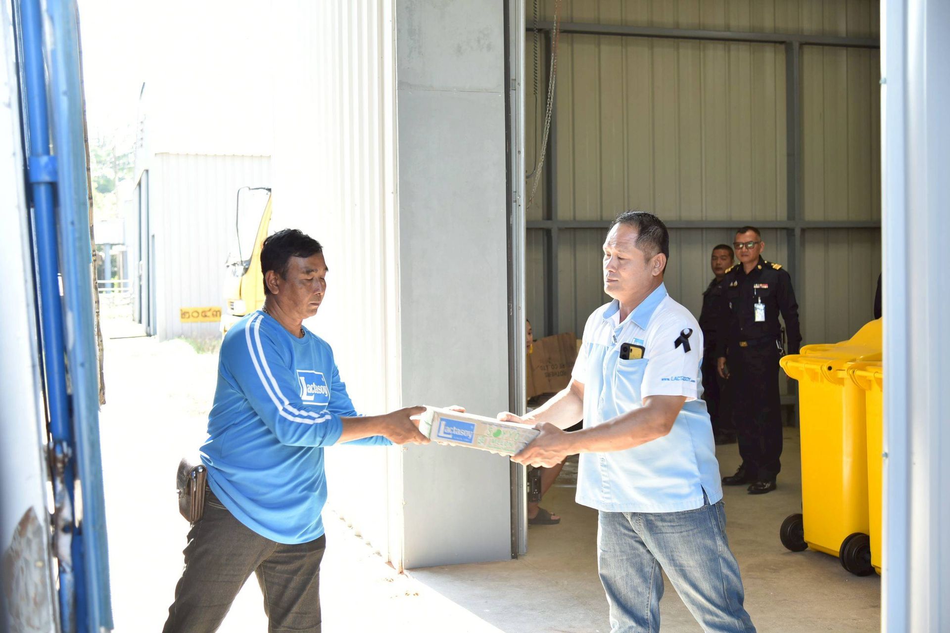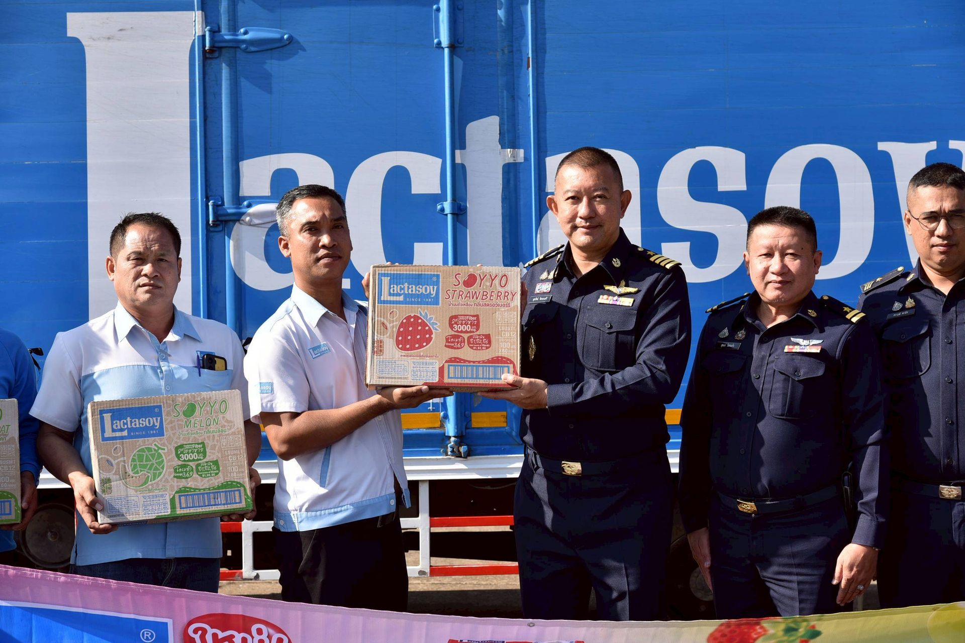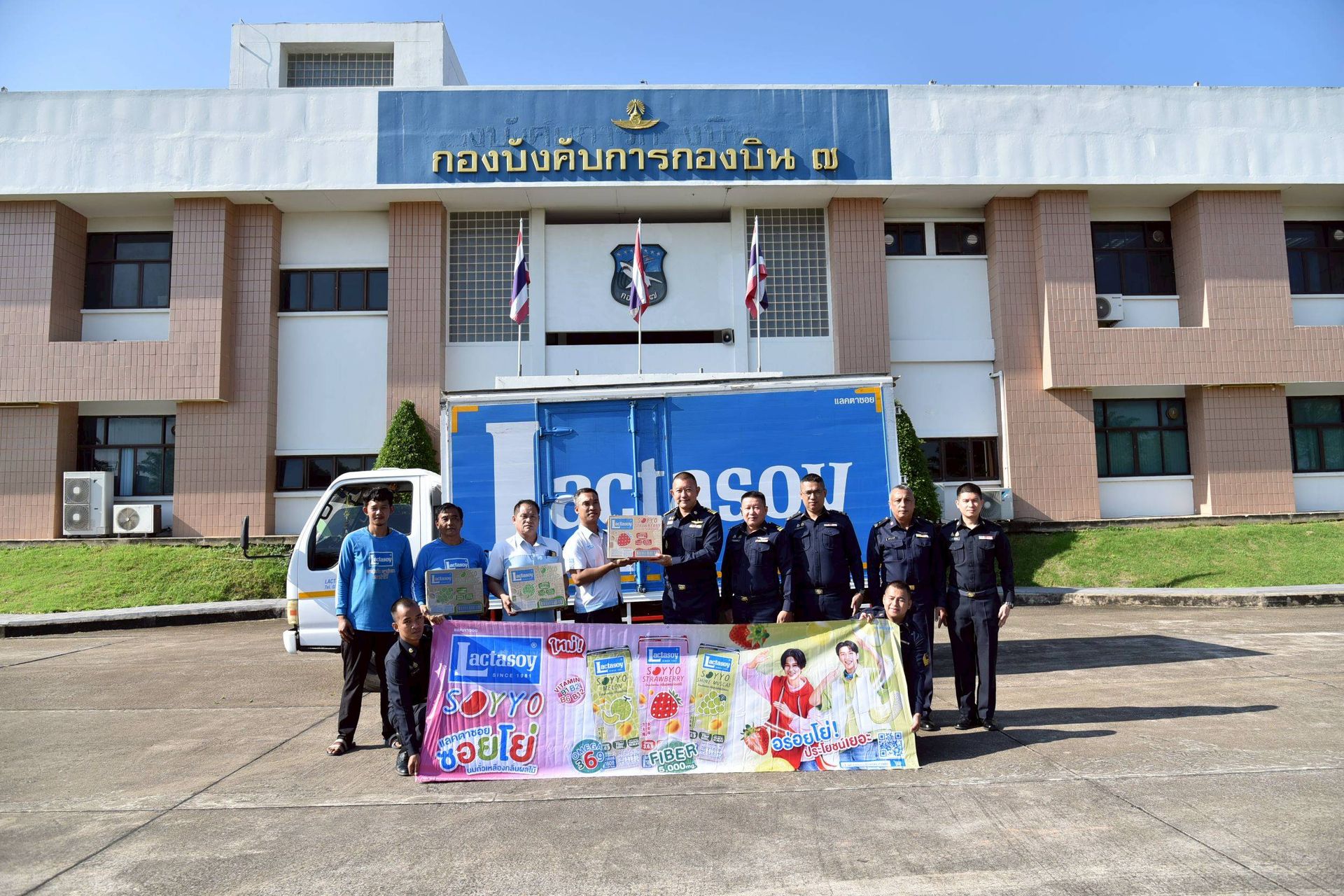 นาวาอากาศเอก ศุภวัจน์ จิตรมนตรี ผู้บังคับการกองบิน ๗ รับมอบสิ่งของอุปโภค บริโภค เพื่อช่วยเหลือผู้ประสบอุทกภัย จากผู้แทนบริษัท แลคตาซอย จำกัด (สาขาสุราษฎร์ธานี) เมื่อวันที่ ๑ ธันวาคม พ.ศ.๒๕๖๘ ณ กองบังคับการ กองบิน ๗ ตำบลมะลวน อำเภอพุนพิน จังหวัดสุราษฎร์ธานี