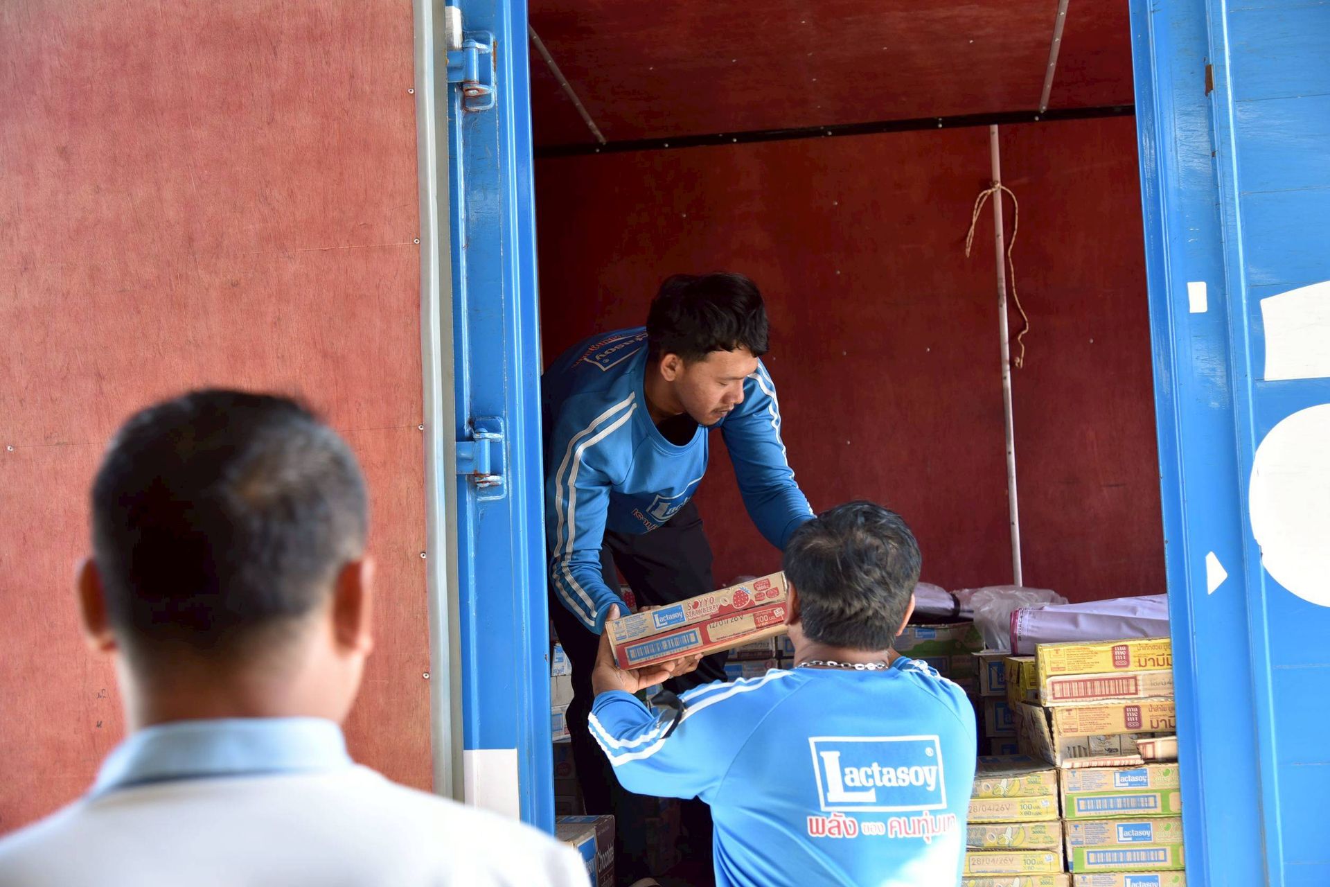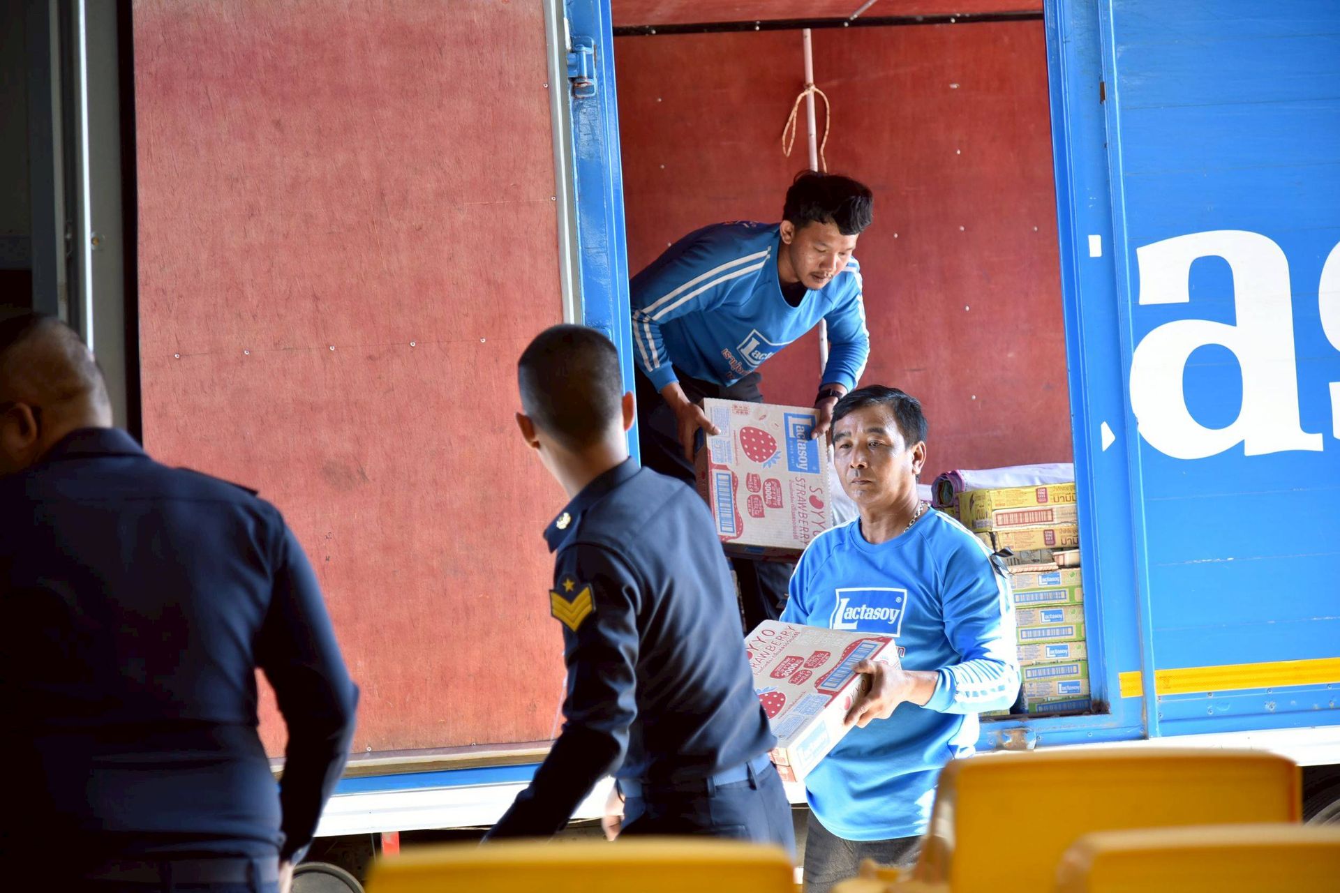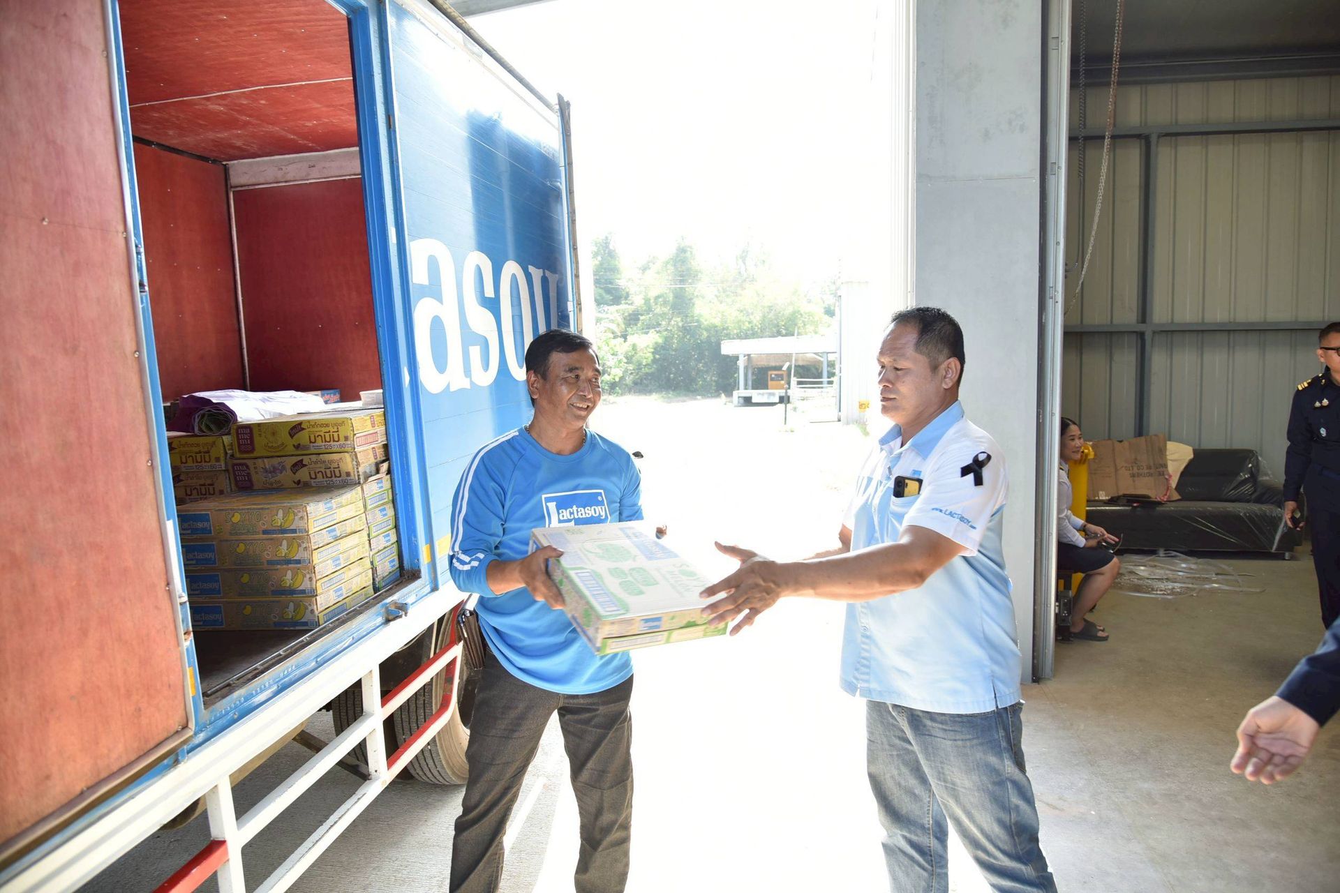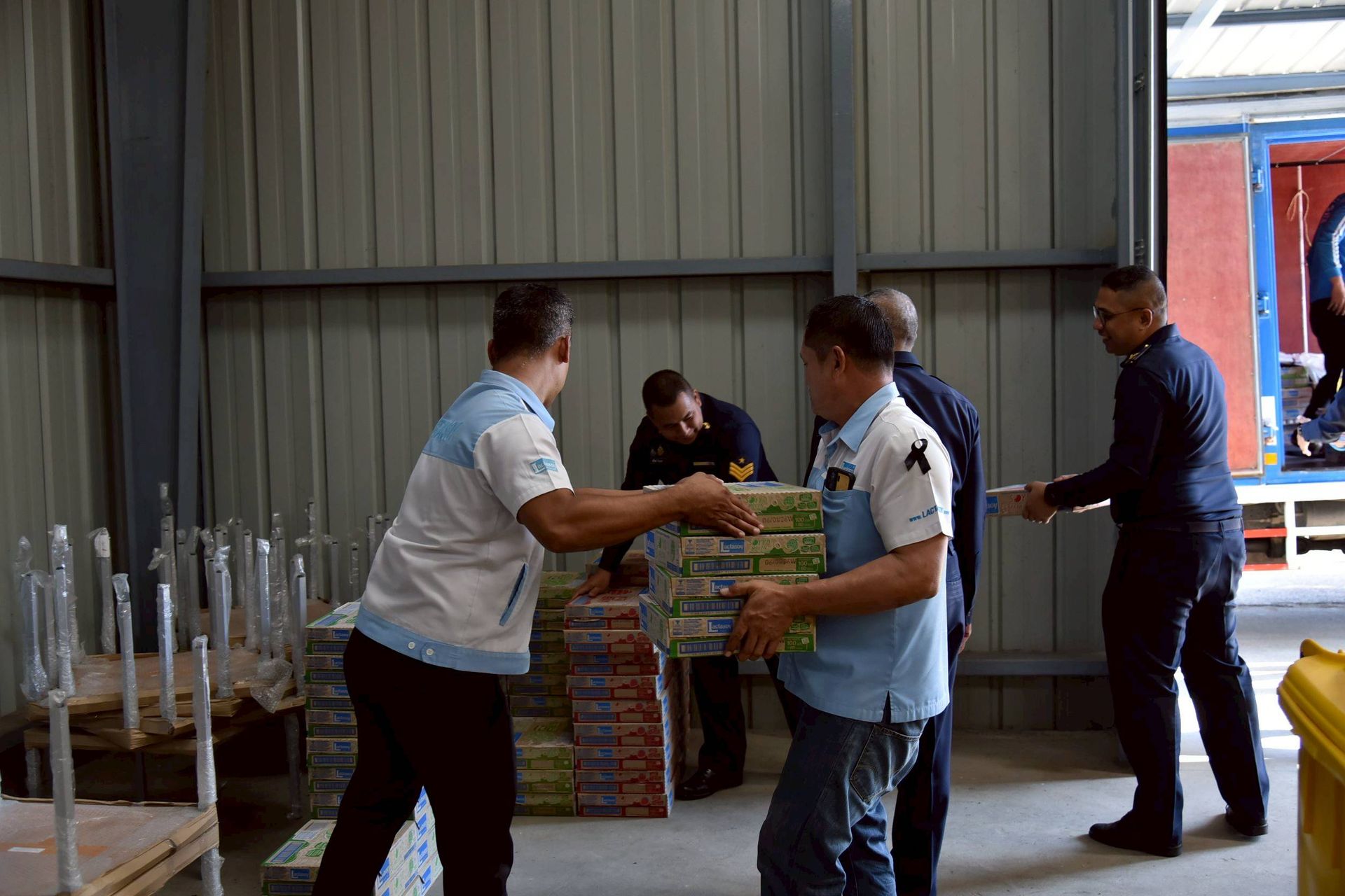 นาวาอากาศเอก ศุภวัจน์ จิตรมนตรี ผู้บังคับการกองบิน ๗ รับมอบสิ่งของอุปโภค บริโภค เพื่อช่วยเหลือผู้ประสบอุทกภัย จากผู้แทนบริษัท แลคตาซอย จำกัด (สาขาสุราษฎร์ธานี) เมื่อวันที่ ๑ ธันวาคม พ.ศ.๒๕๖๘ ณ กองบังคับการ กองบิน ๗ ตำบลมะลวน อำเภอพุนพิน จังหวัดสุราษฎร์ธานี