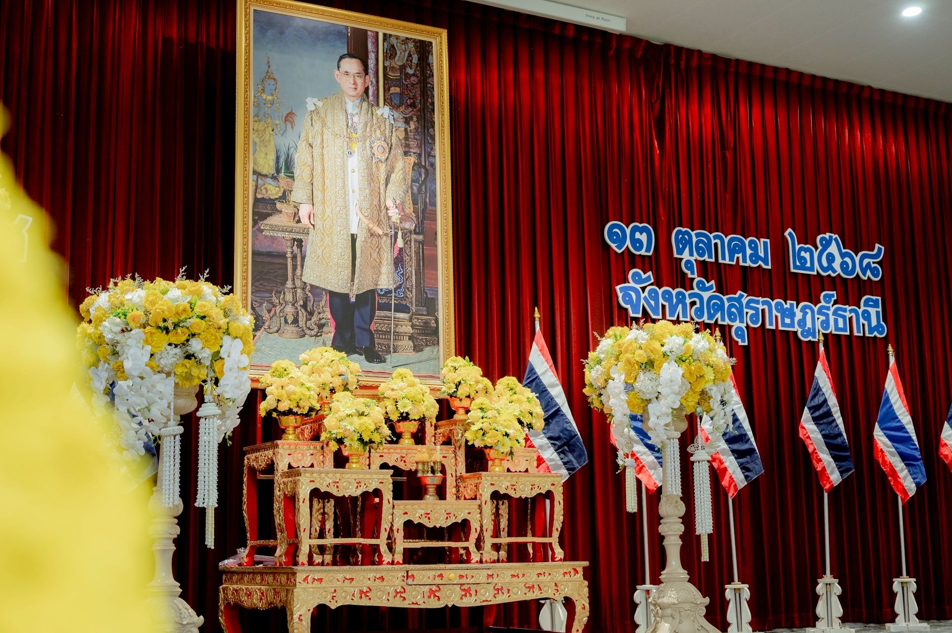 นายธีรุตม์ ศุภวิบูลย์ผล ผู้ว่าราชการจังหวัดสุราษฎร์ธานี พร้อมด้วยหัวหน้าส่วนราชการ และหน่วยงานต่าง ๆ ภายในจังหวัดสุราษฎร์ธานี ร่วมกันจัดกิจกรรมวางพวงมาลา เนื่องในวันนวมินทรมหาราช ๑๓ ตุลาคม ๒๕๖๘ เพื่อเป็นการน้อมรำลึกถึงพระมหากรุณาธิคุณของ พระบาทสมเด็จพระบรมชนกาธิเบศร มหาภูมิพลอดุลยเดชมหาราช บรมนาถบพิตร ที่ทรงมีต่อปวงชนชาวไทยเป็นล้นพ้นอย่างหาที่สุดมิได้