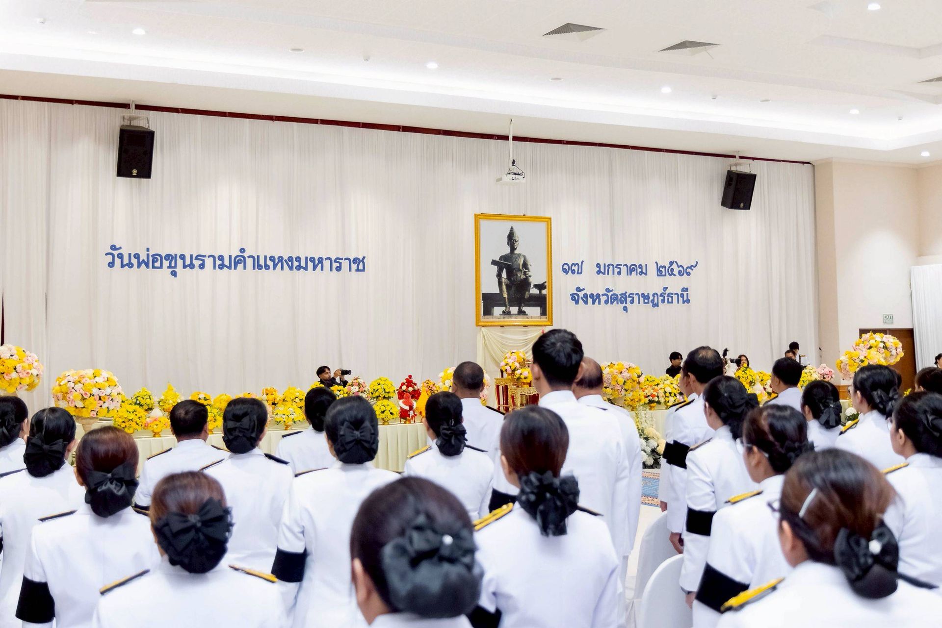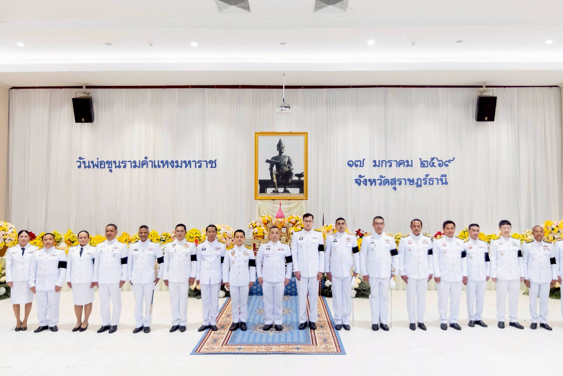 นายจุมพฏ วรรณฉัตรสิริ ผู้ว่าราชการจังหวัดสุราษฎร์ธานี พร้อมด้วยหัวหน้าส่วนราชการ และหน่วยงานต่าง ๆ ภายในจังหวัดสุราษฎร์ธานี ร่วมจัดงานรัฐพิธี “วันพ่อขุนรามคำแหงมหาราช” ประจำปีพุทธศักราช ๒๕๖๙ โดยมีพิธีวางพานพุ่มดอกไม้ถวายราชสักการะ เพื่อแสดงออกถึงความจงรักภักดีต่อสถาบันพระมหากษัตรย์