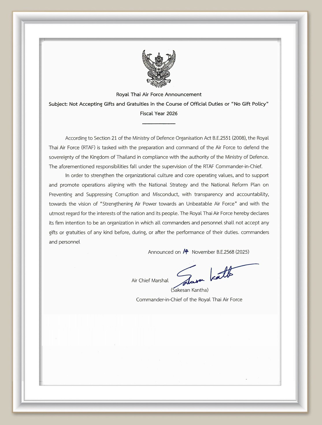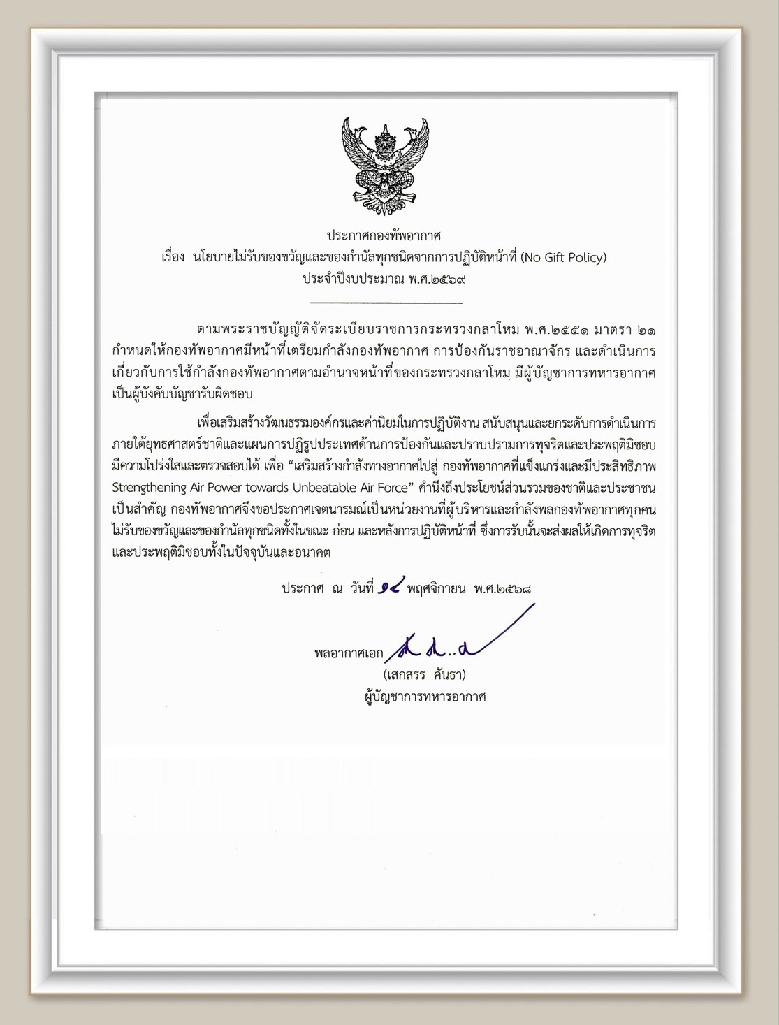 ประชาสัมพันธ์ นโยบายไม่รับของขวัญและของกำนัลทุกชนิดจากการปฏิบัติหน้าที่ (No Gift Policy) ประจำปีงบประมาณ พ.ศ.๒๕๖๙