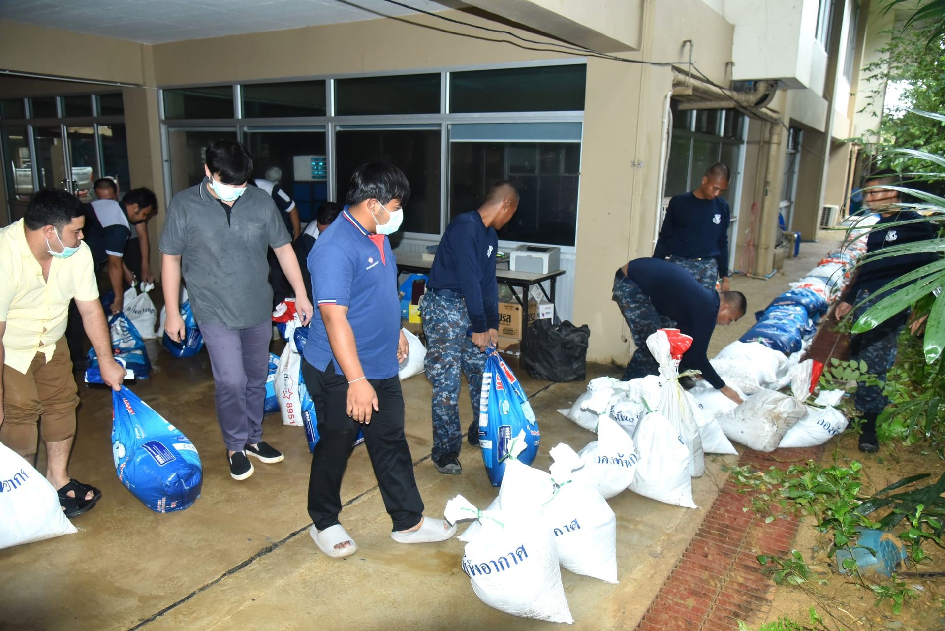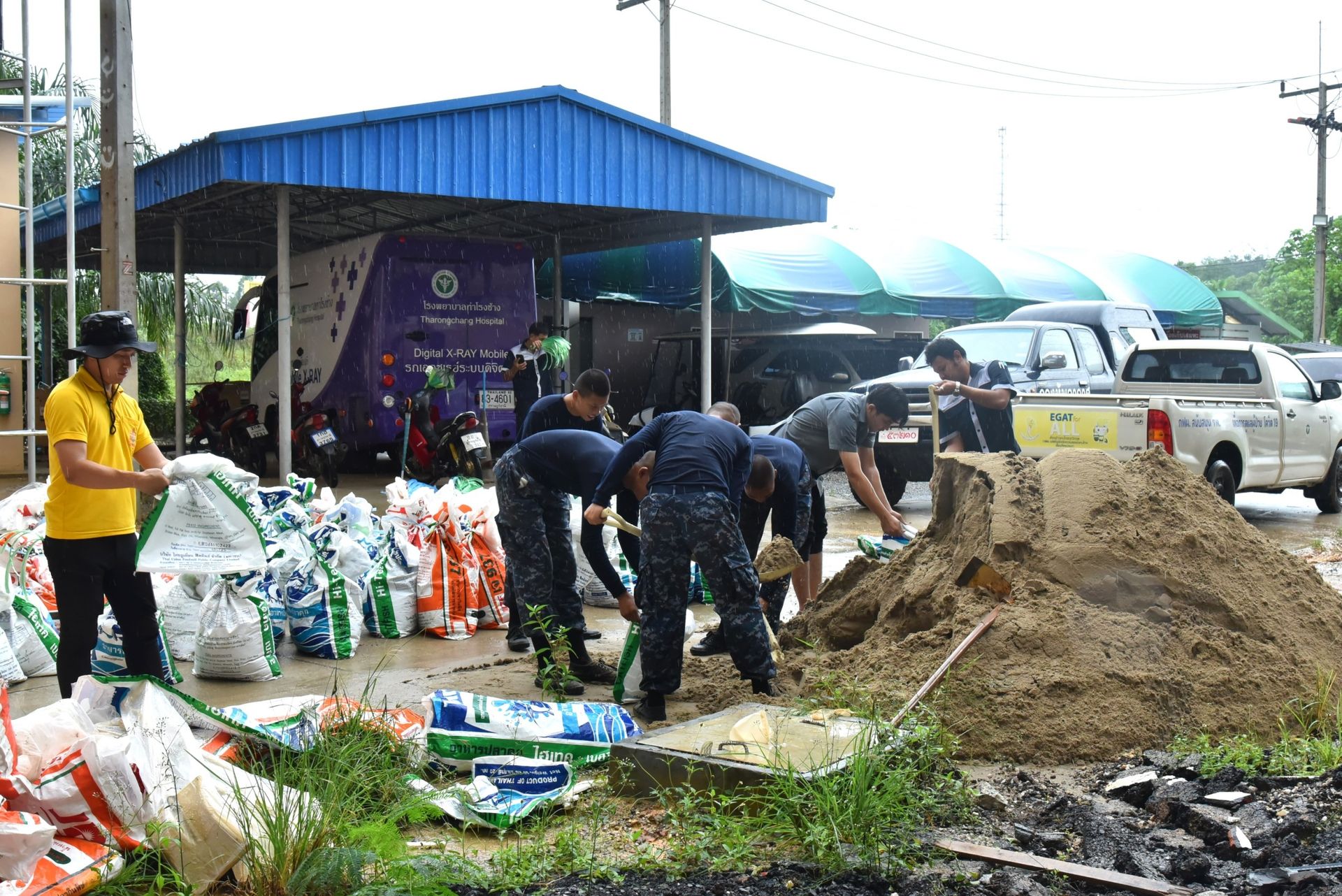 นาวาอากาศเอก ศุภวัจน์ จิตรมนตรี ผู้บังคับการกองบิน ๗ ในฐานะผู้อำนวยการศูนย์บรรเทาสาธารณภัย กองบิน ๗ พร้อมด้วย รองผู้บังคับการกองบิน ๗ นำเจ้าหน้าที่ศูนย์บรรเทาสาธารณภัย กองบิน ๗ และกำลังพลเข้าช่วยเหลือขนย้ายสิ่งของ พร้อมทั้งยกสิ่งของขึ้นที่สูงในพื้นที่ปลอดภัย และทำการบรรจุกระสอบทรายเพื่อทำพนังกั้นน้ำป้องกันน้ำล้นทะลักเข้าในบริเวณพื้นที่โรงพยาบาลท่าโรงช้าง โดยบูรณาการร่วมกับนายวิสูตร อินทรกำเนิด นายอำเภอพุนพิน, เจ้าหน้าที่โรงพยาบาล และหน่วยงานในพื้นที่ เมื่อวันที่ ๑๖ ธันวาคม พ.ศ.๒๕๖๗ ณ โรงพยาบาลท่าโรงช้าง ตำบลท่าโรงช้าง อำเภอพุนพิน จังหวัดสุราษฎร์ธานี
