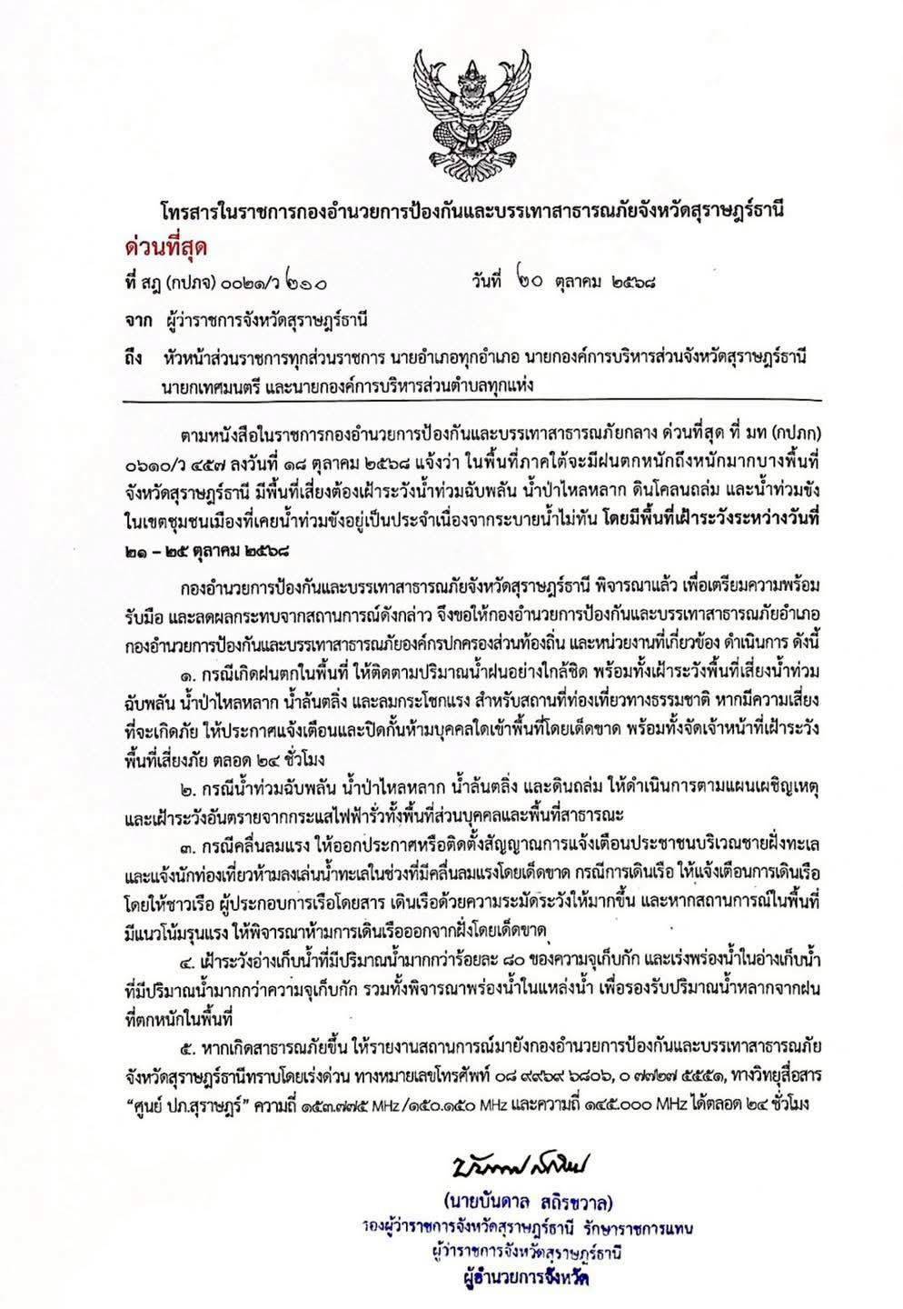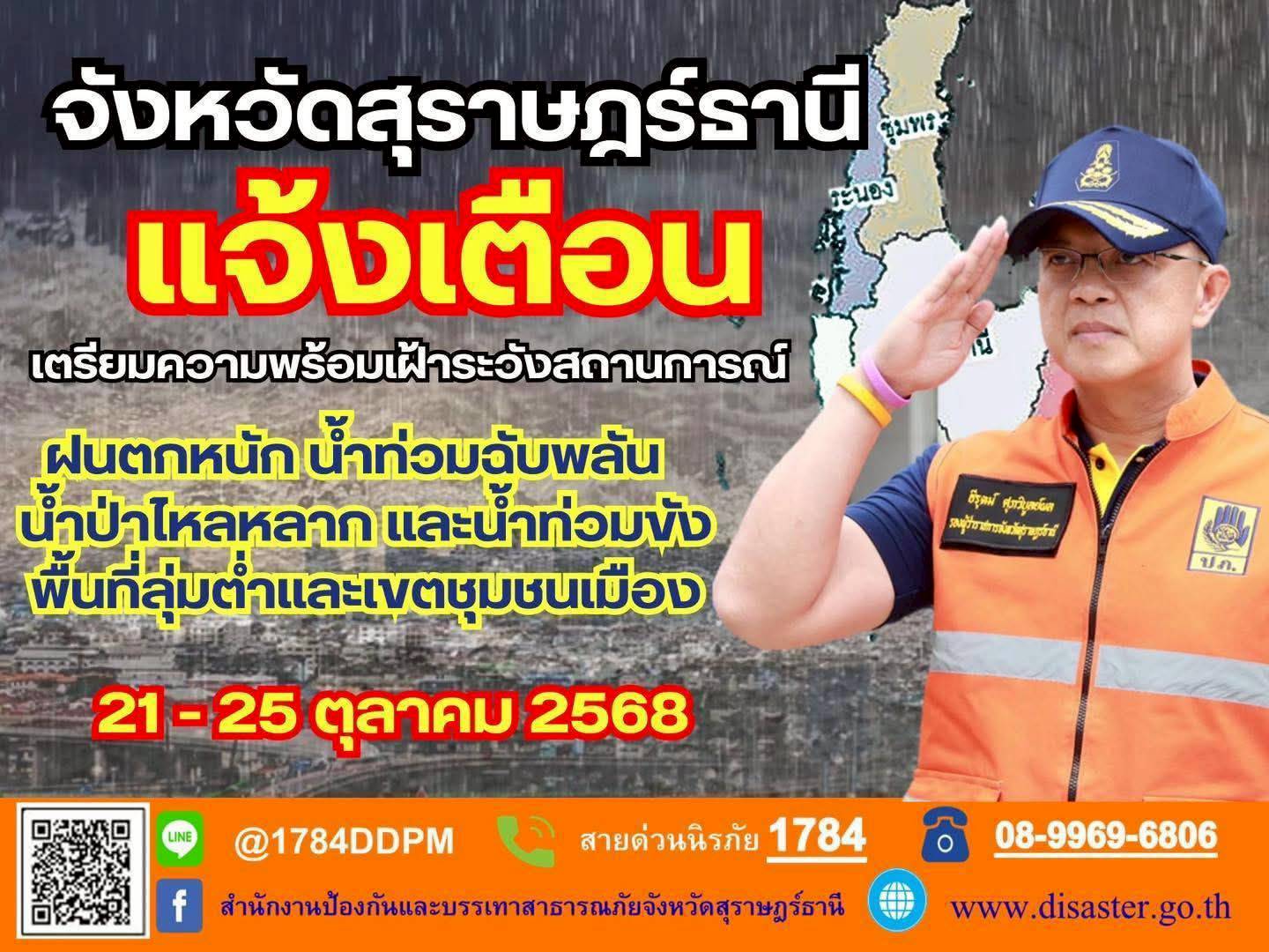 นาวาอากาศเอก ศุภวัจน์ จิตรมนตรี ผู้บังคับการกองบิน ๗ ในฐานะผู้อำนวยการศูนย์บรรเทาสาธารณภัยกองบิน ๗ มอบหมายให้เจ้าหน้าที่ศูนย์บรรเทาสาธารณภัยกองบิน ๗ เข้าร่วมประชุมเตรียมความพร้อมรับสถานการณ์อุทกภัย วาตภัย และดินถล่ม ของจังหวัดสุราษฎร์ธานี เพื่อเป็นการเตรียมความพร้อมรับมือสถานการณ์ภัยพิบัติที่อาจจะเกิดขึ้นในห้วงฤดูฝน เพื่อเป็นการป้องกันและลดการสูญเสียชีวิตและทรัพย์สินของประชาชน ณ ห้องประชุมตาปี ชั้น ๔ ศาลากลางจังหวัดสุราษฎร์ธานี อำเภอเมืองสุราษฎร์ธานี จังหวัดสุราษฎร์ธานี เมื่อวันที่ ๒๑ ตุลาคม พ.ศ.๒๕๖๘