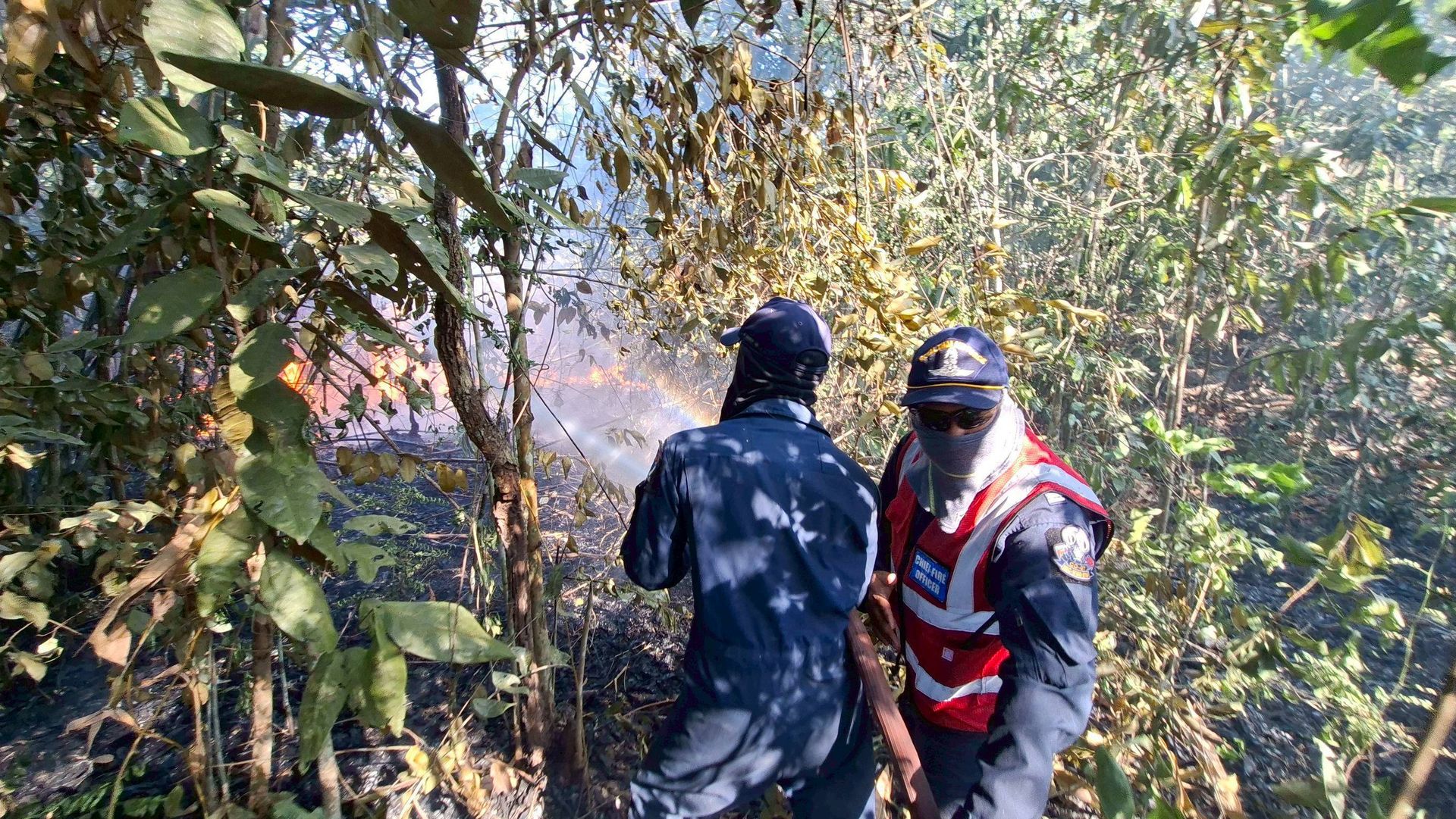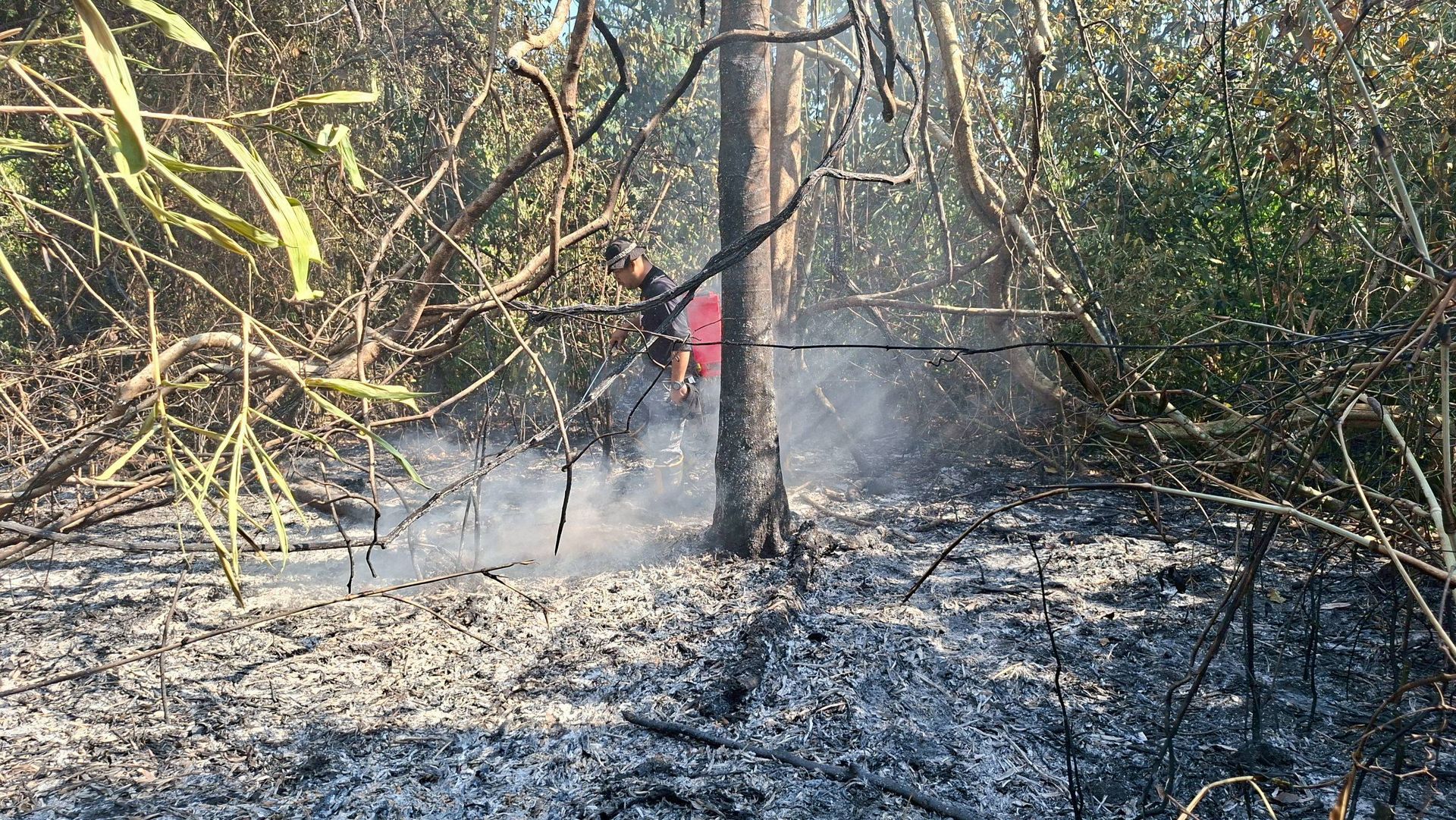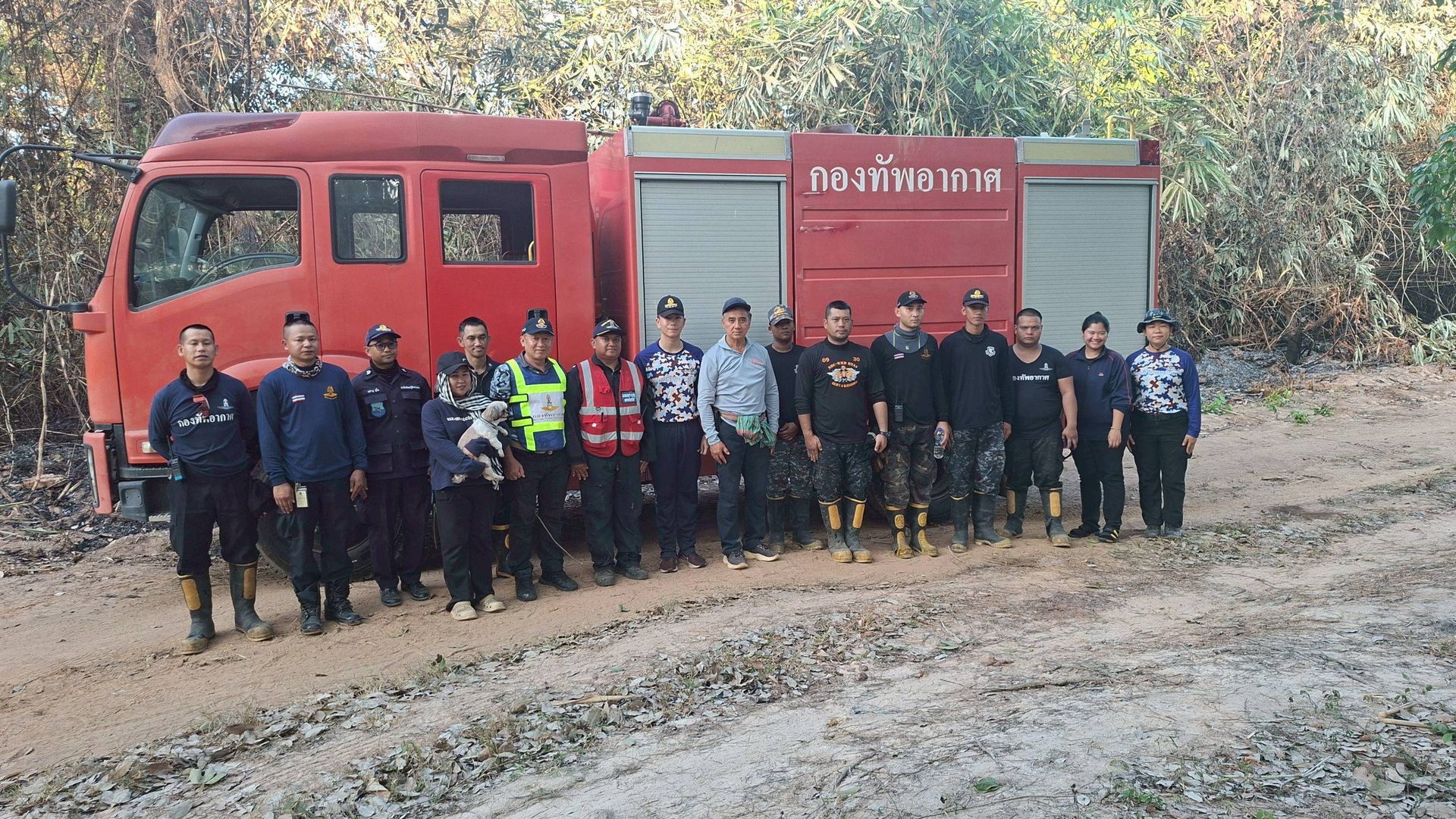ศูนย์บรรเทาสาธารณภัยกองบิน ๗ ระดมกำลังเจ้าหน้าที่พร้อมยุทโธปกรณ์ เข้าควบคุมสถานการณ์เพลิงไหม้ที่เกิดขึ้นซ้ำในพื้นที่บ้านห้วยต้นตอ ตำบลมะลวน อำเภอพุนพิน จังหวัดสุราษฎร์ธานี ภายหลังพบการปะทุในจุดเดิม ท่ามกลางสภาพอากาศร้อนจัดที่เอื้อต่อการลุกลามของเพลิง