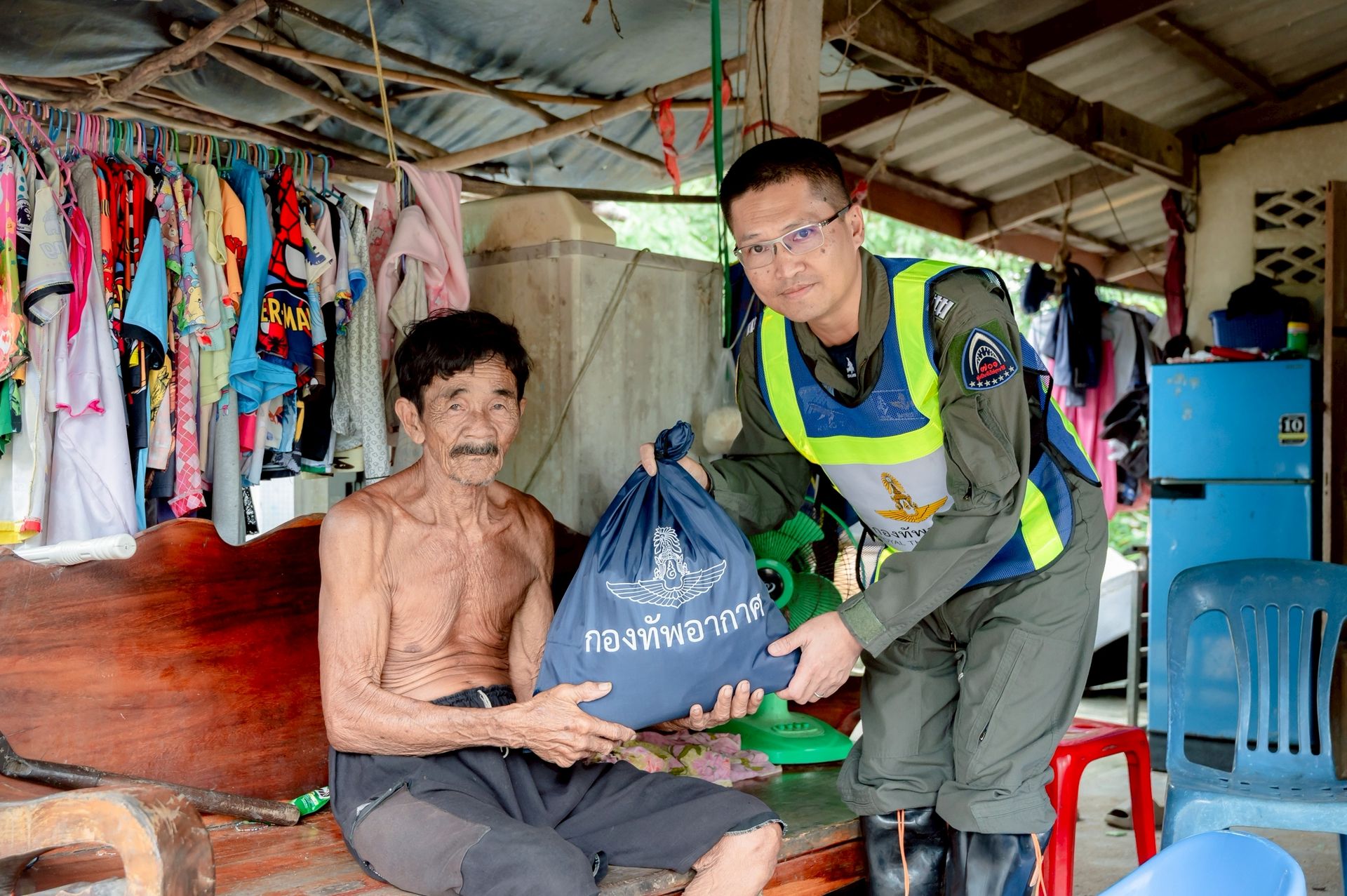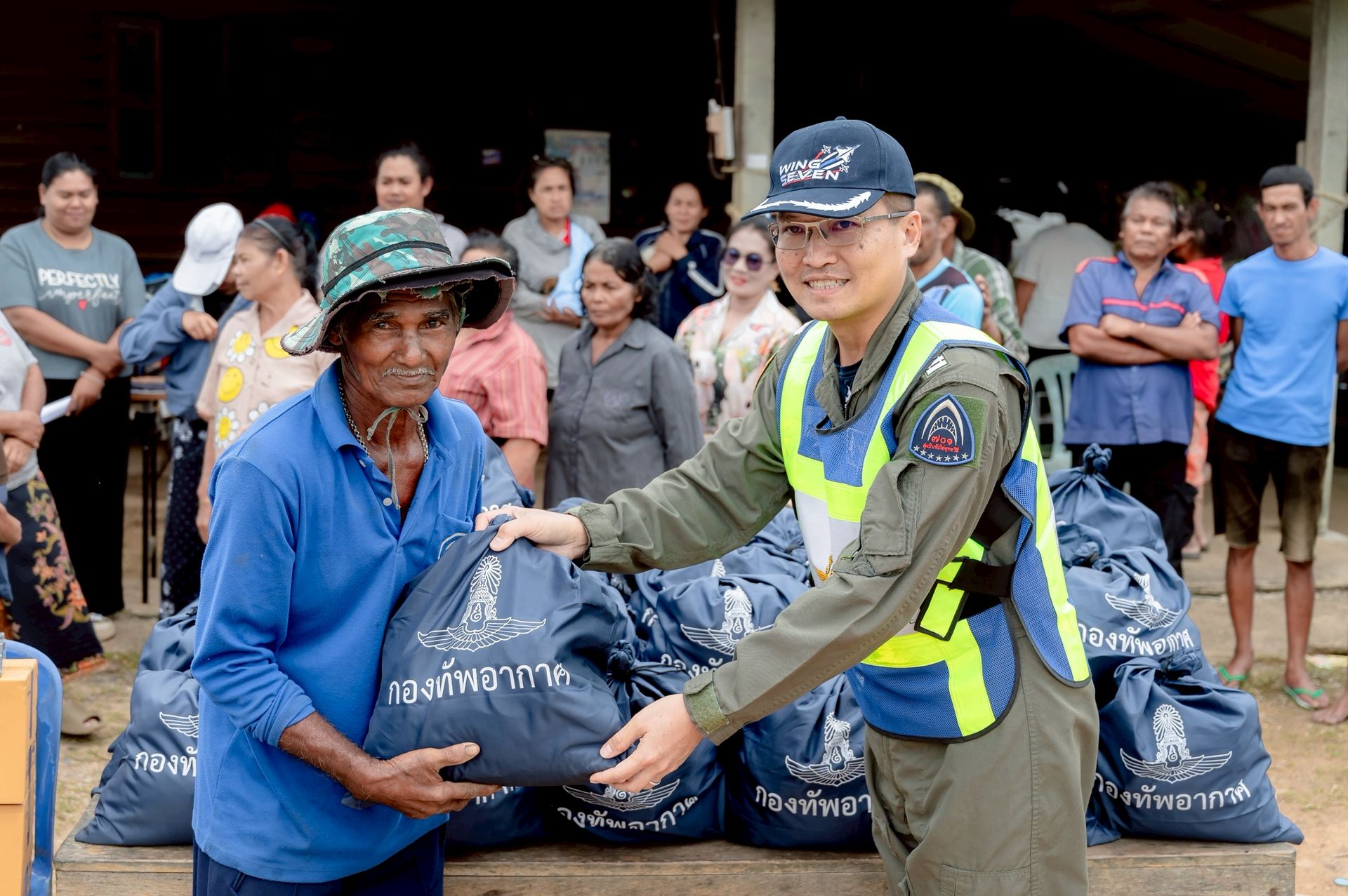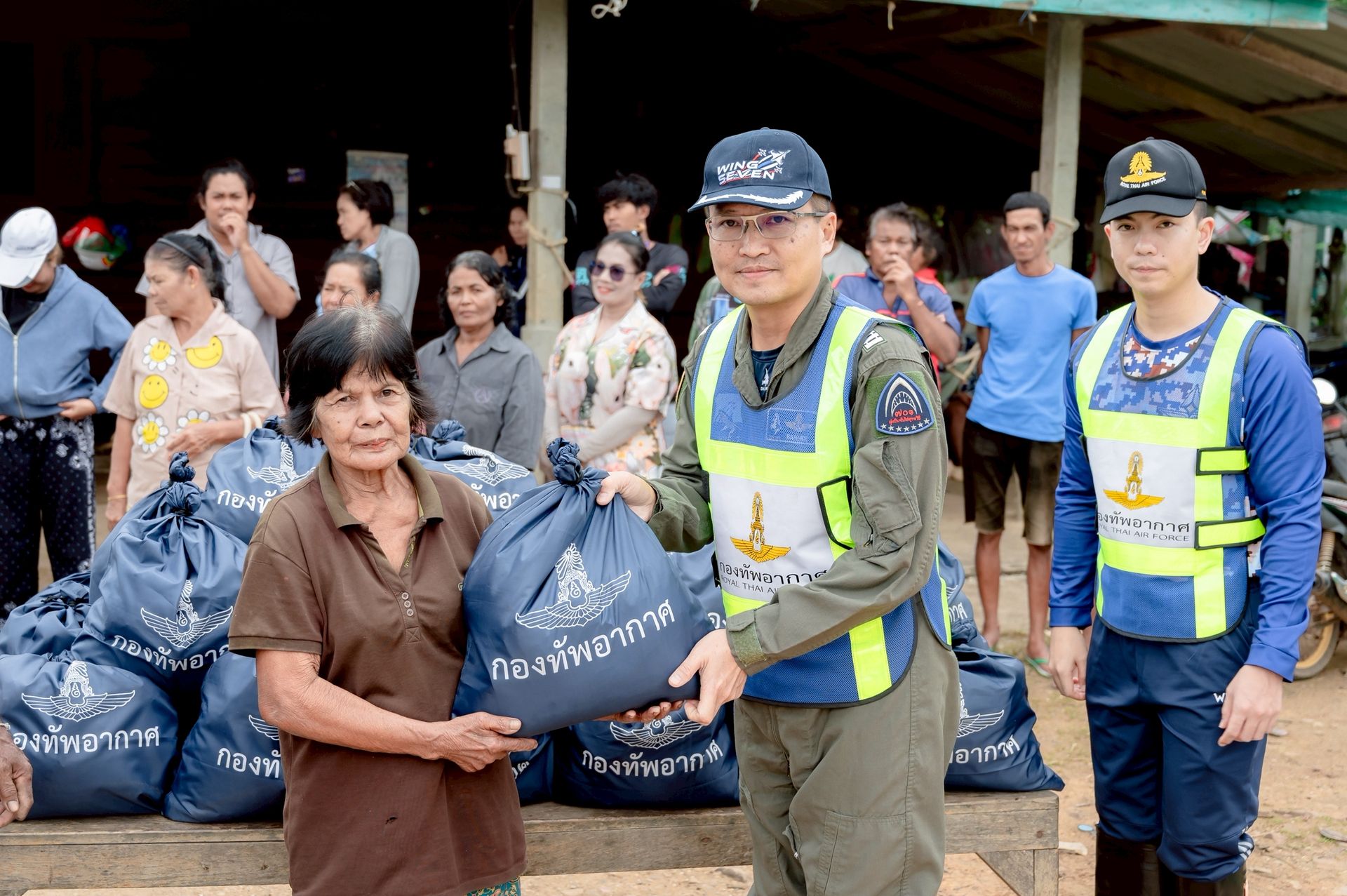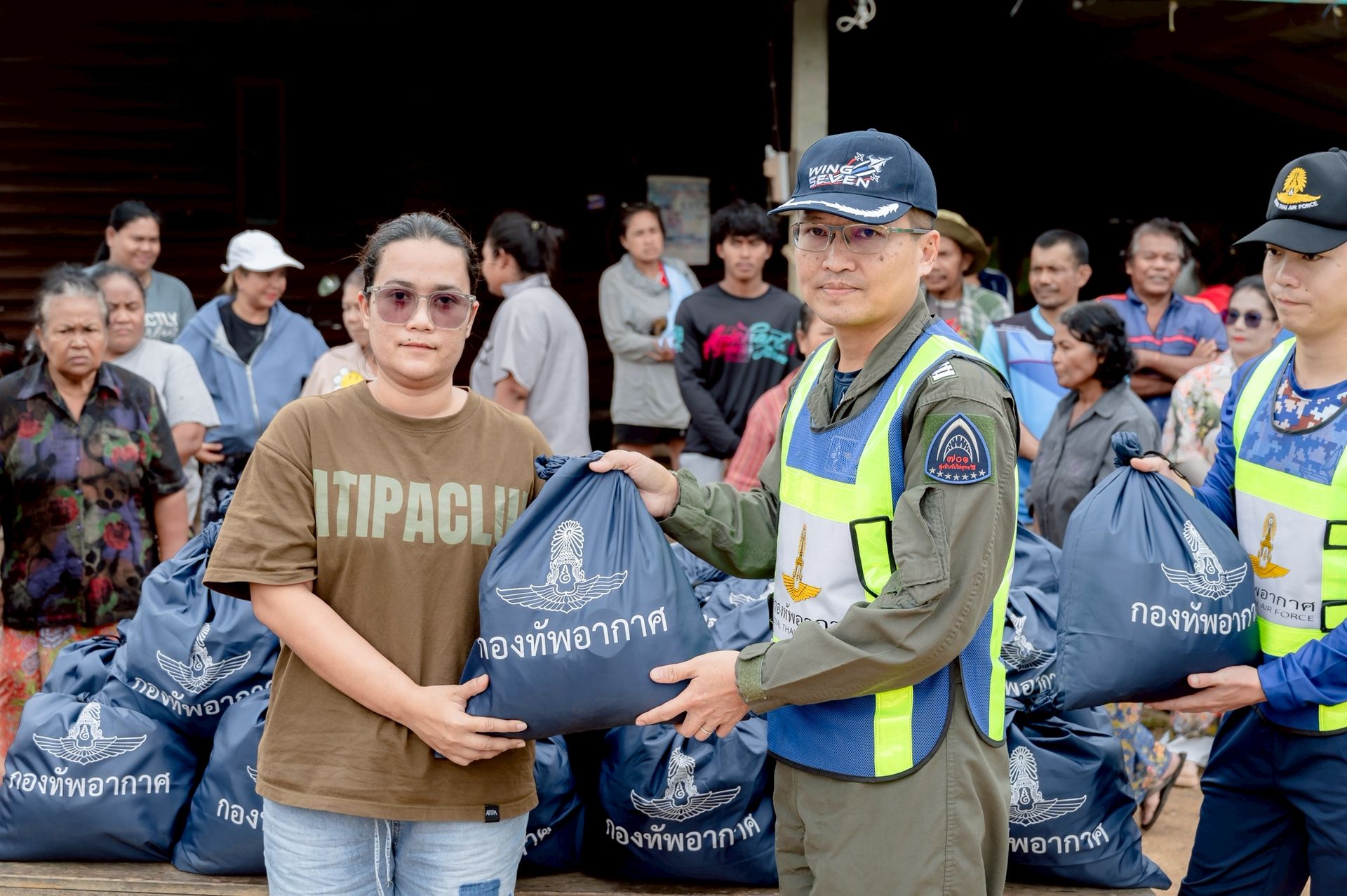 นาวาอากาศเอก ศุภวัจน์ จิตรมนตรี ผู้บังคับการกองบิน ๗ ในฐานะผู้อำนวยการศูนย์บรรเทาสาธารณภัยกองบิน ๗ มอบหมายให้ นาวาอากาศเอก เฉลิมชัย ชำนาญยนต์ รองผู้บังคับการกองบิน ๗ / รองผู้อำนวยการศูนย์บรรเทาสาธารณภัยกองบิน ๗ พร้อมด้วย เจ้าหน้าที่ศูนย์บรรเทาสาธารณภัย กองบิน ๗ ลงพื้นที่มอบถุงยังชีพ น้ำดื่ม และชุดยาสามัญประจำบ้านแก่ผู้ประสบภัยจากน้ำท่วมขัง เพื่อช่วยบรรเทาความเดือดร้อนในเบื้องต้น ตลอดจนพบปะพูดคุยให้กำลังใจแก่ประชาชน ณ ตำบลท่าเคย อำเภอท่าฉาง จังหวัดสุราษฎร์ธานี เมื่อวันที่ ๒๗ พฤศจิกายน พ.ศ.๒๕๖๘